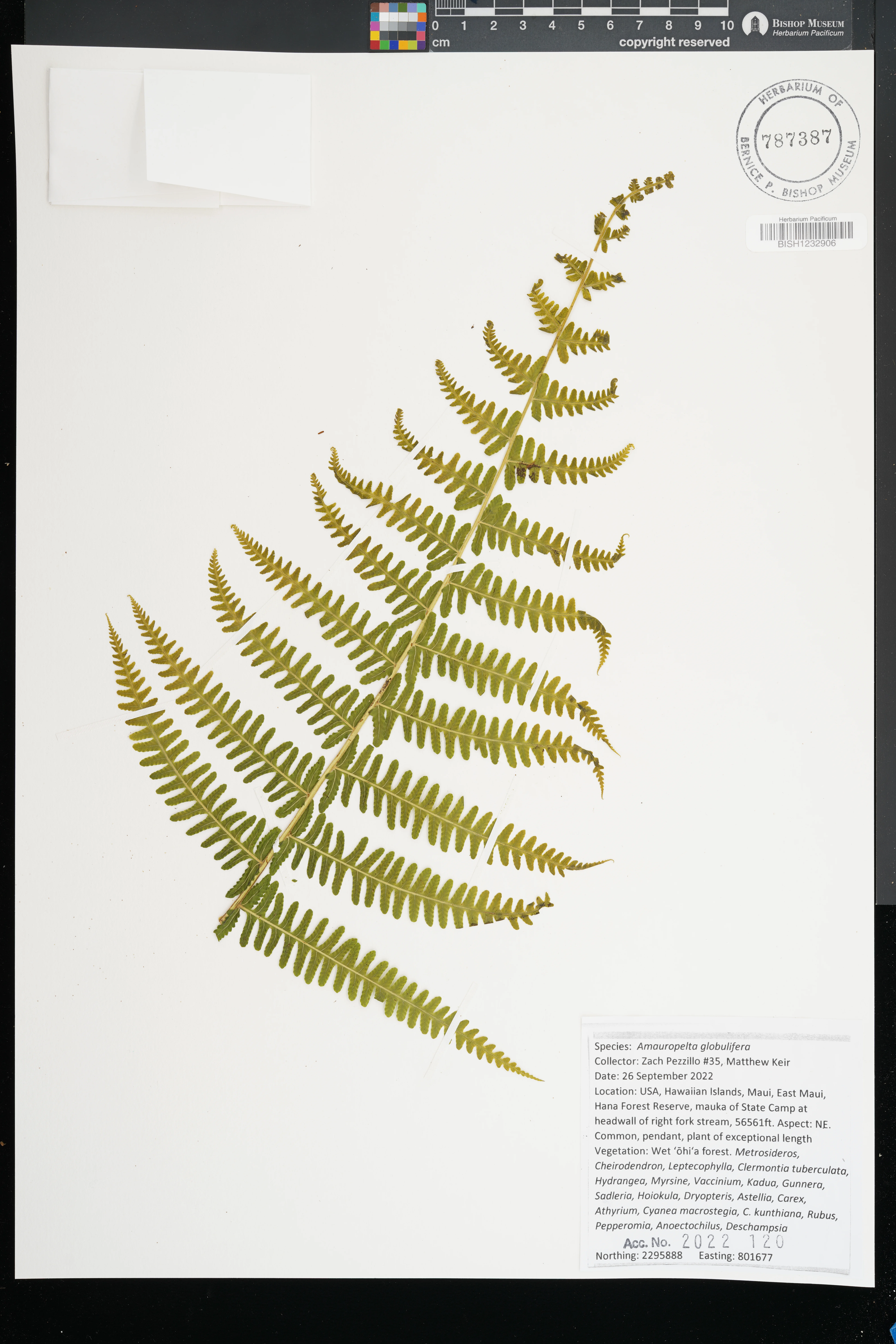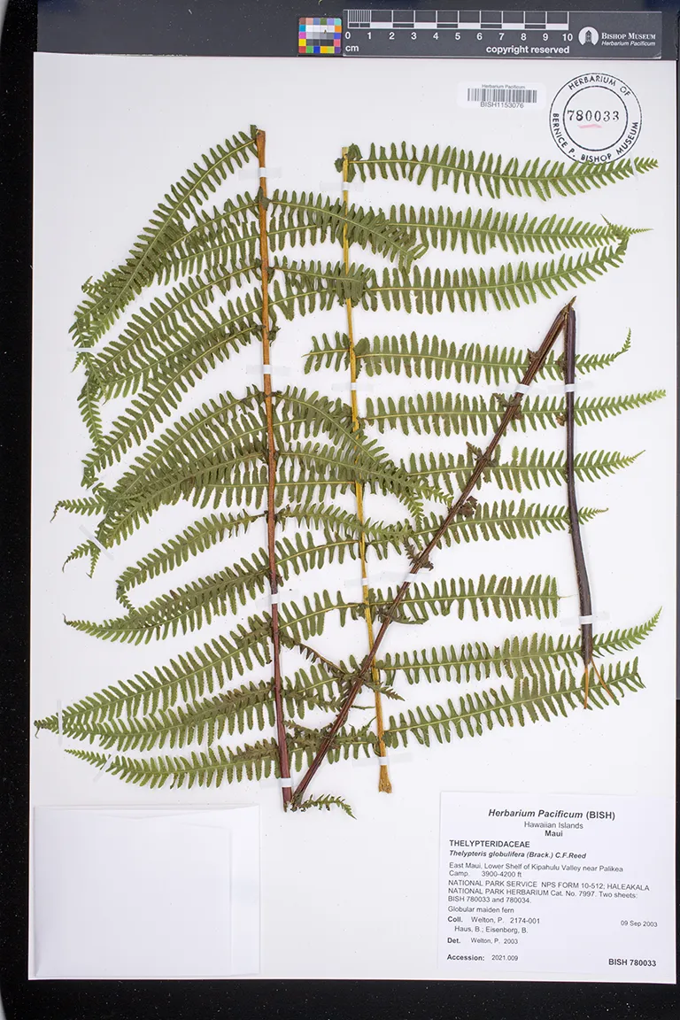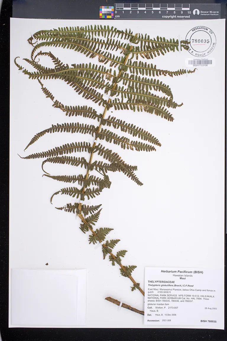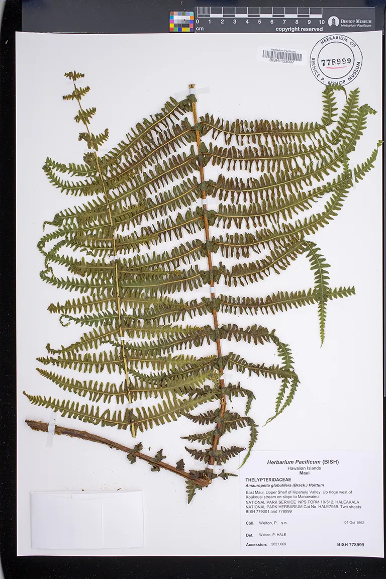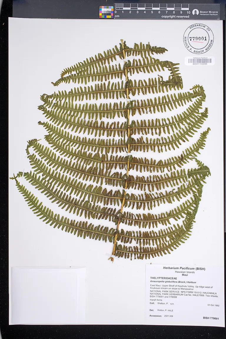 Palmer 2003:47 (K, O, Mo, L, M, H [as A. globulifera]); Snow et al. 2011:15 (Syn. A. globulifera = Thelypteris globulifera); Pteridophyte Phylogeny Group 2016:585/Fawcett & Smith 2021:26 (Syn. T. globulifera = A. globulifera)