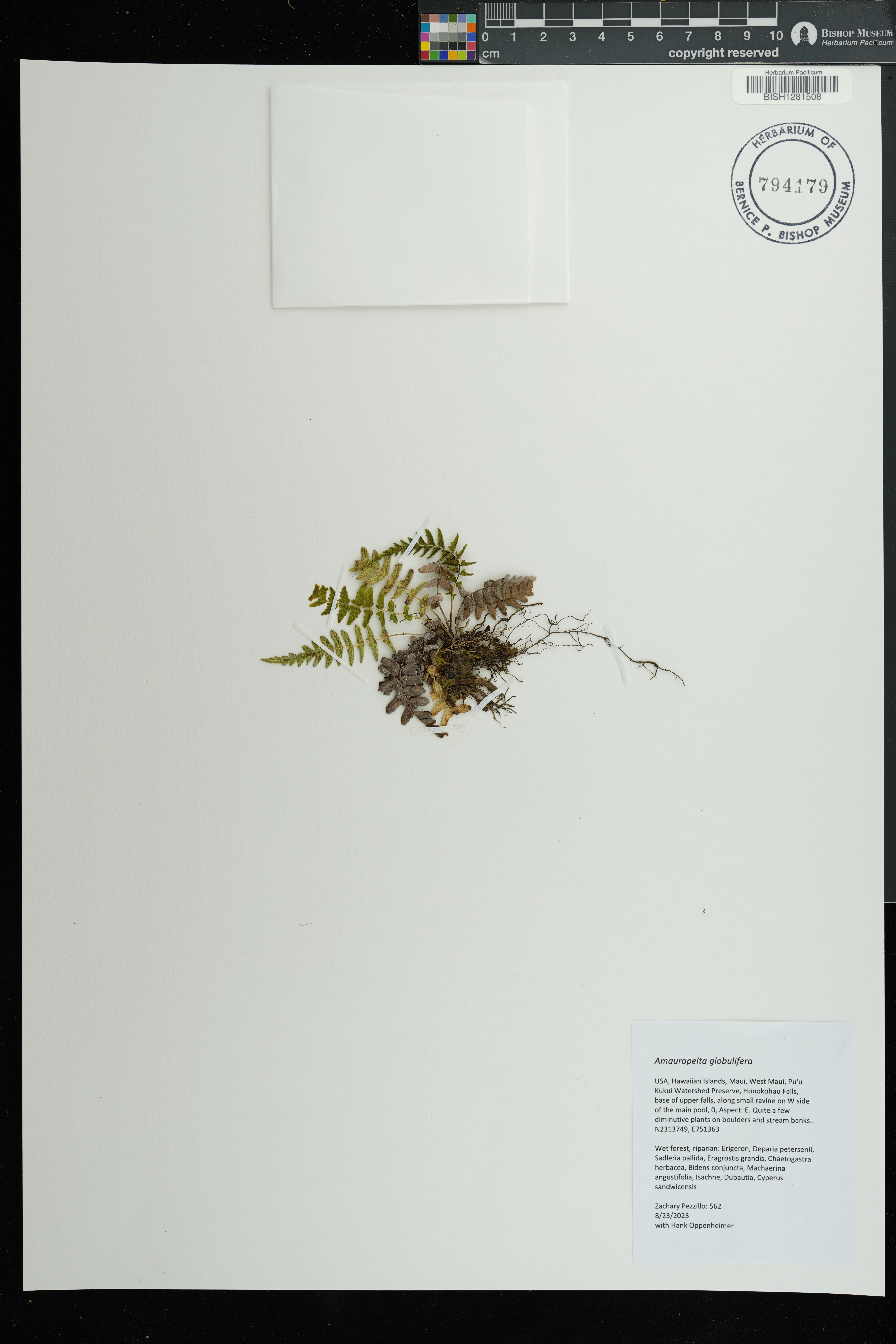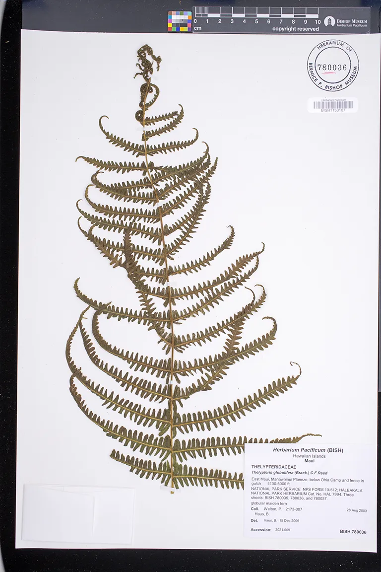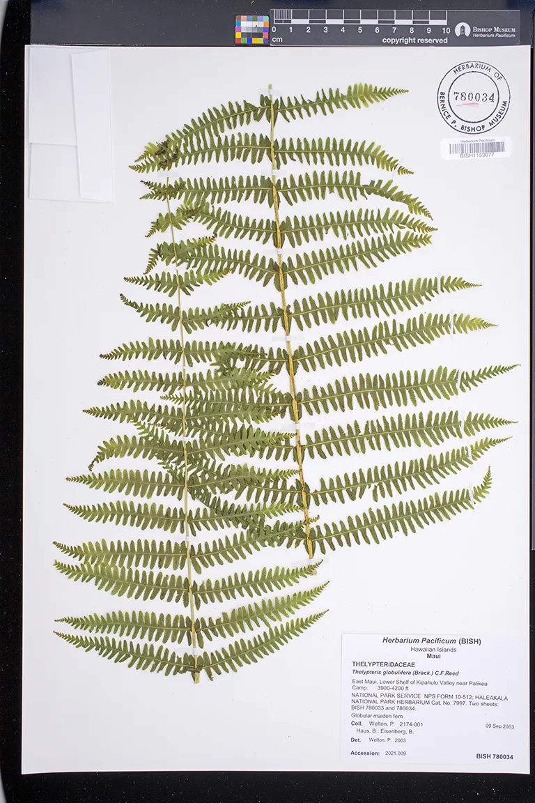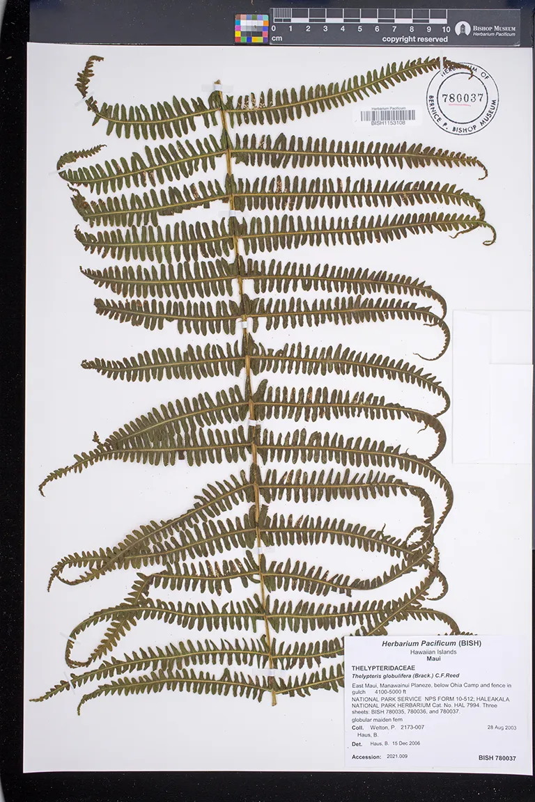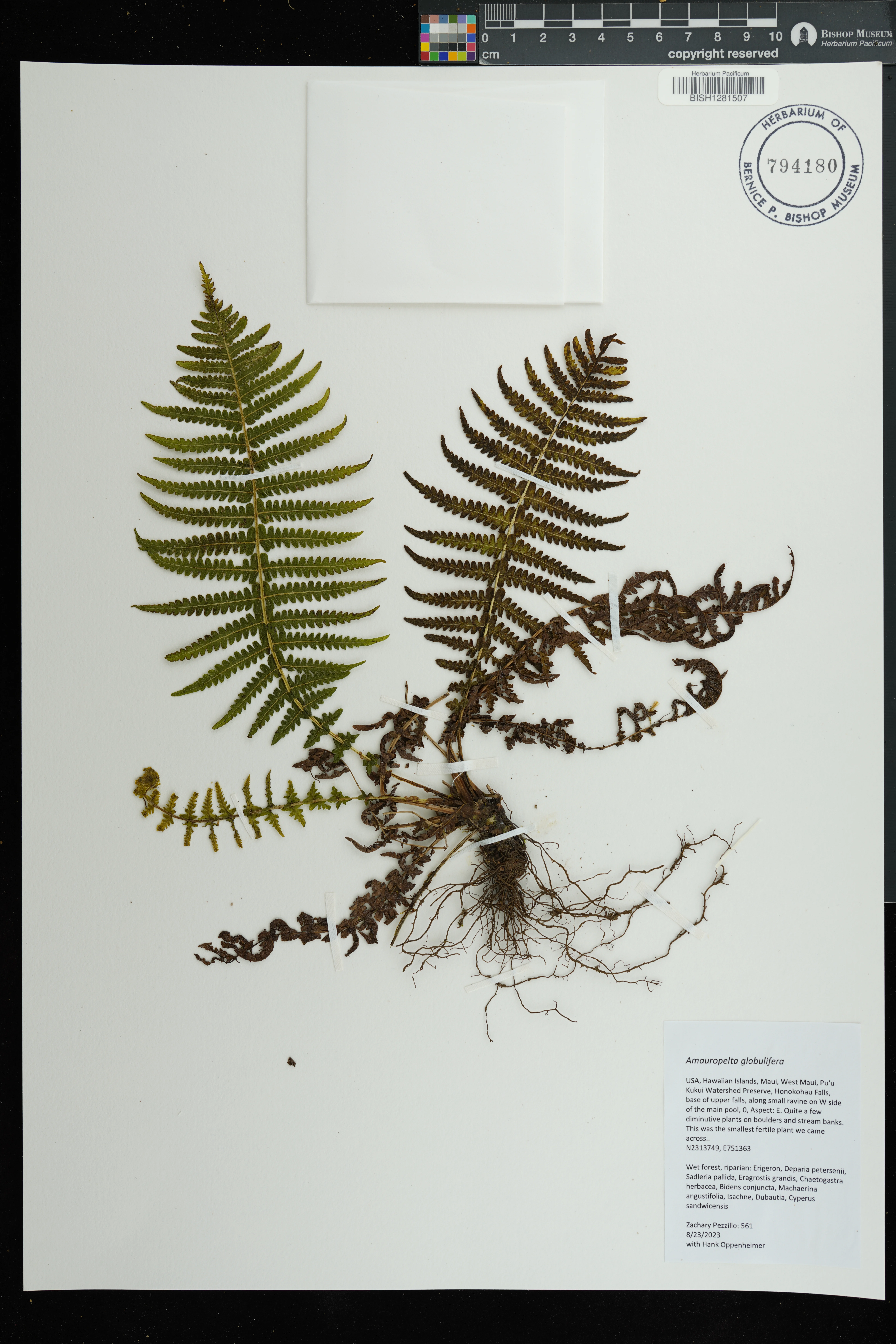 Palmer 2003:47 (K, O, Mo, L, M, H [as A. globulifera]); Snow et al. 2011:15 (Syn. A. globulifera = Thelypteris globulifera); Pteridophyte Phylogeny Group 2016:585/Fawcett & Smith 2021:26 (Syn. T. globulifera = A. globulifera)