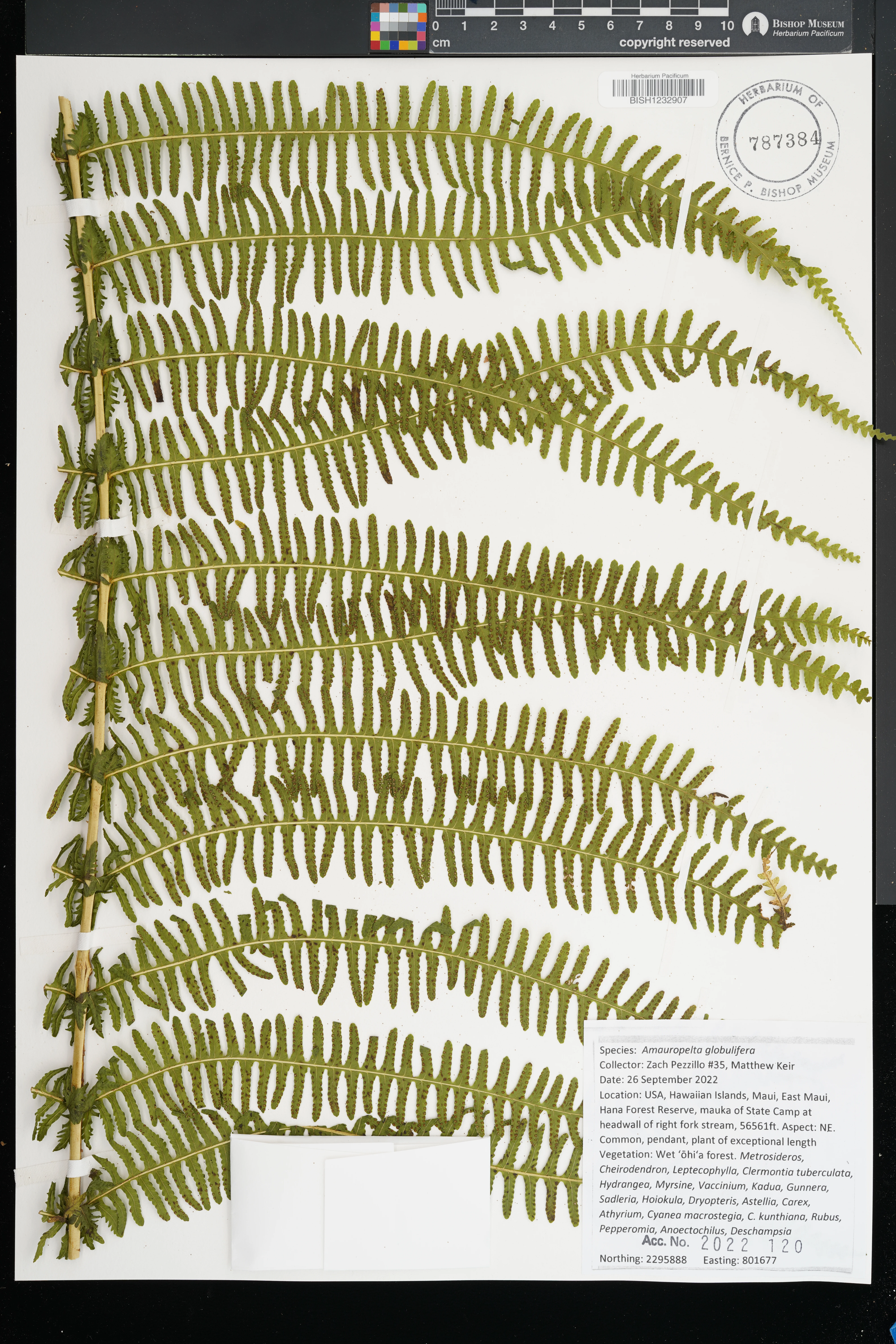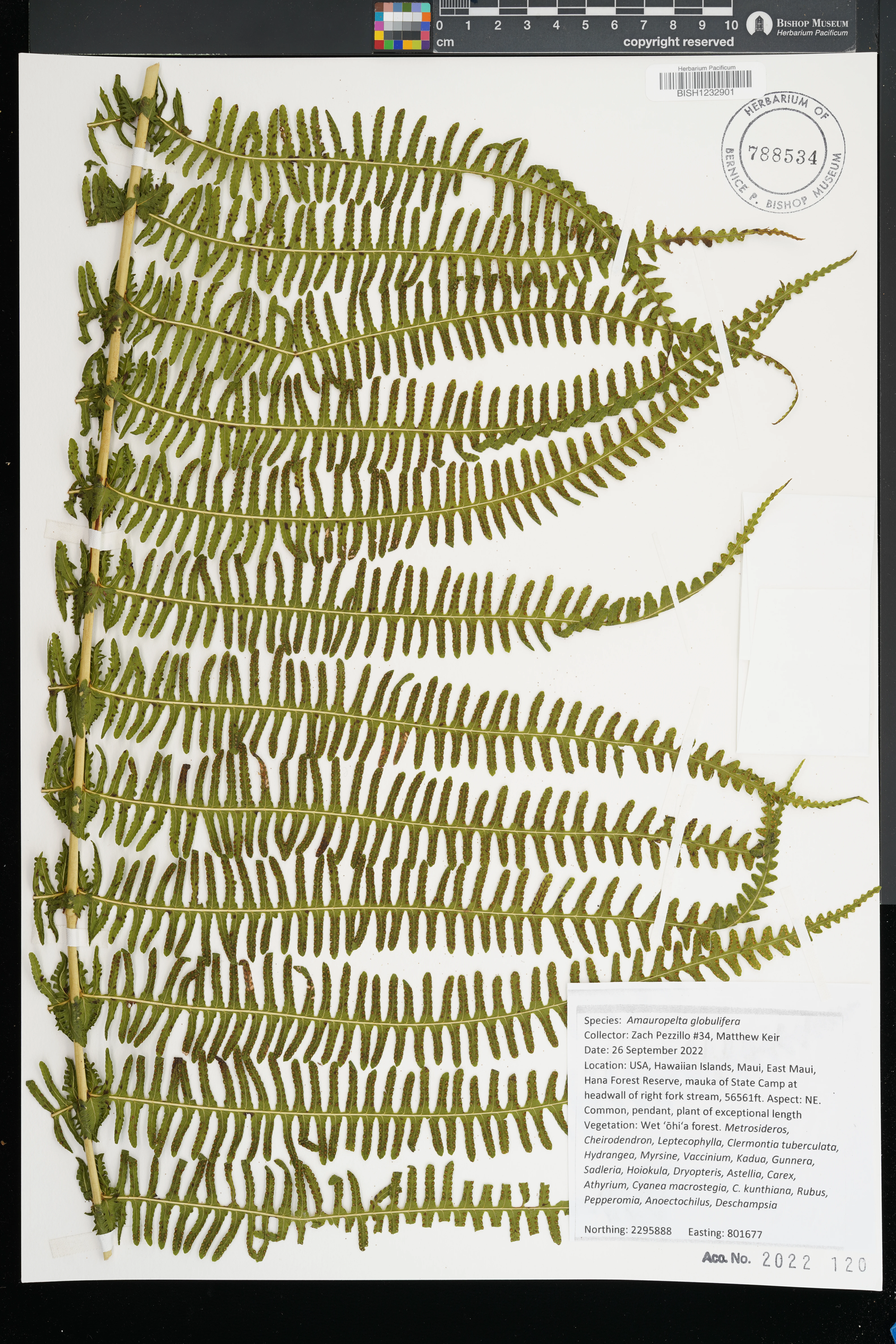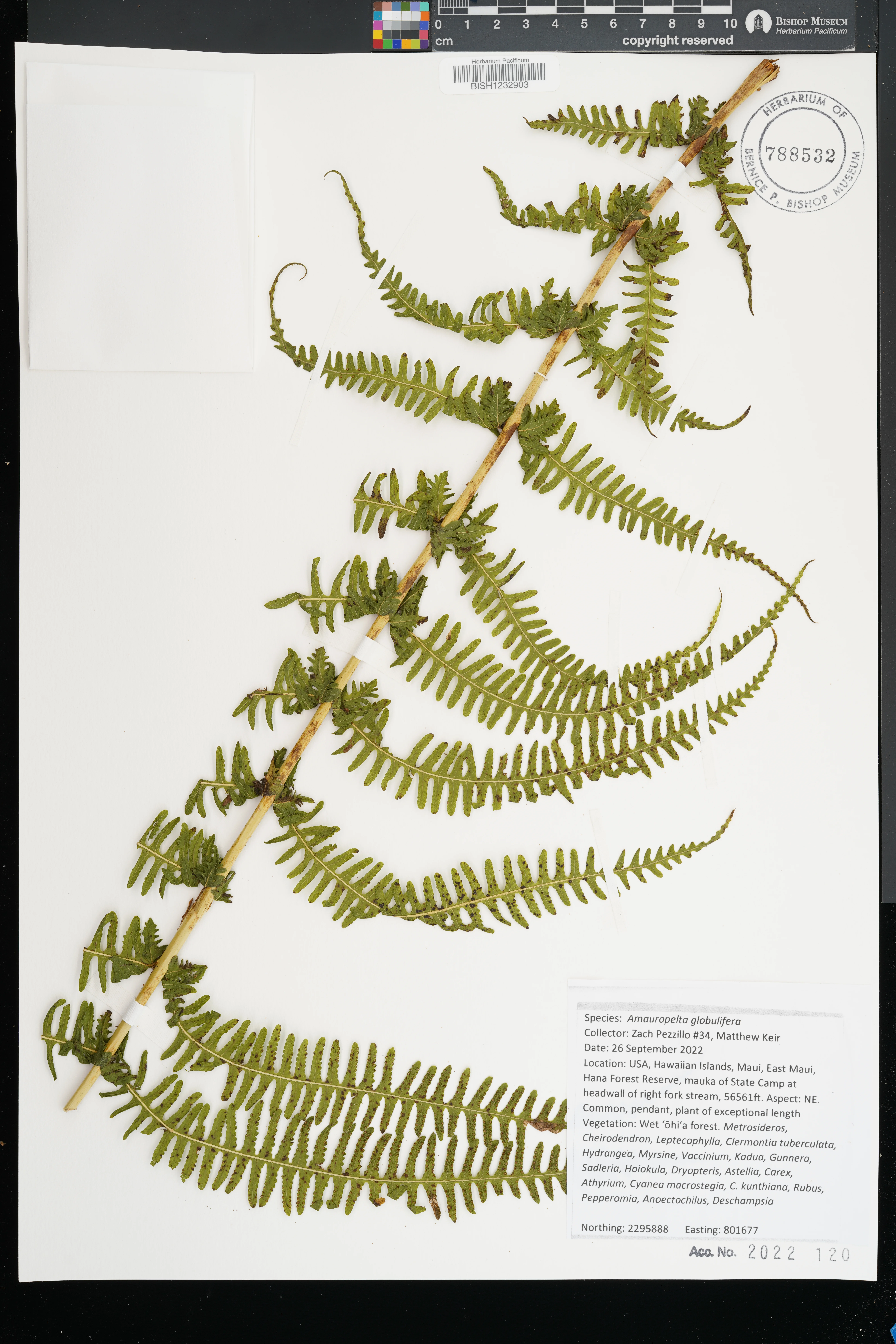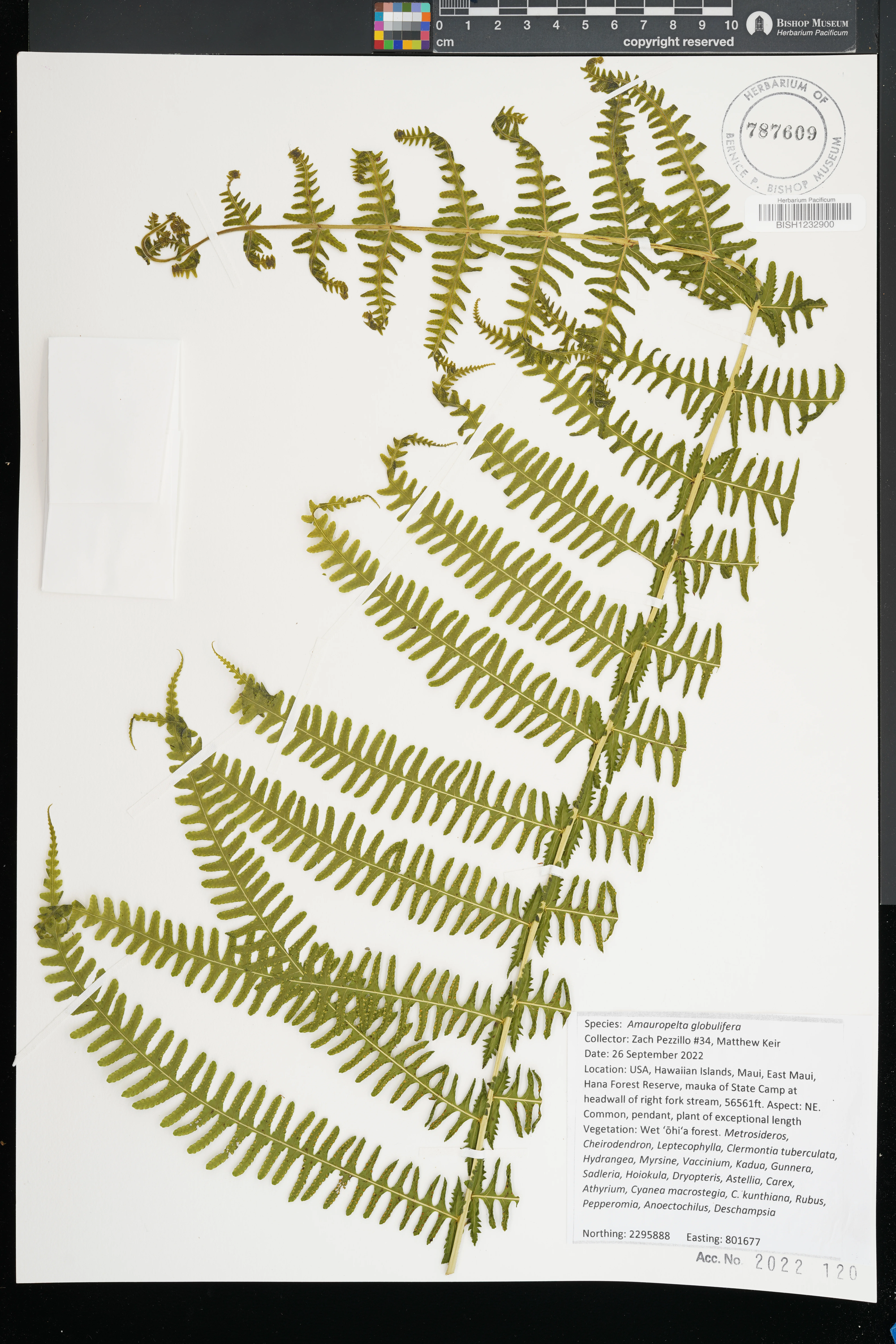 Palmer 2003:47 (K, O, Mo, L, M, H [as A. globulifera]); Snow et al. 2011:15 (Syn. A. globulifera = Thelypteris globulifera); Pteridophyte Phylogeny Group 2016:585/Fawcett & Smith 2021:26 (Syn. T. globulifera = A. globulifera)
