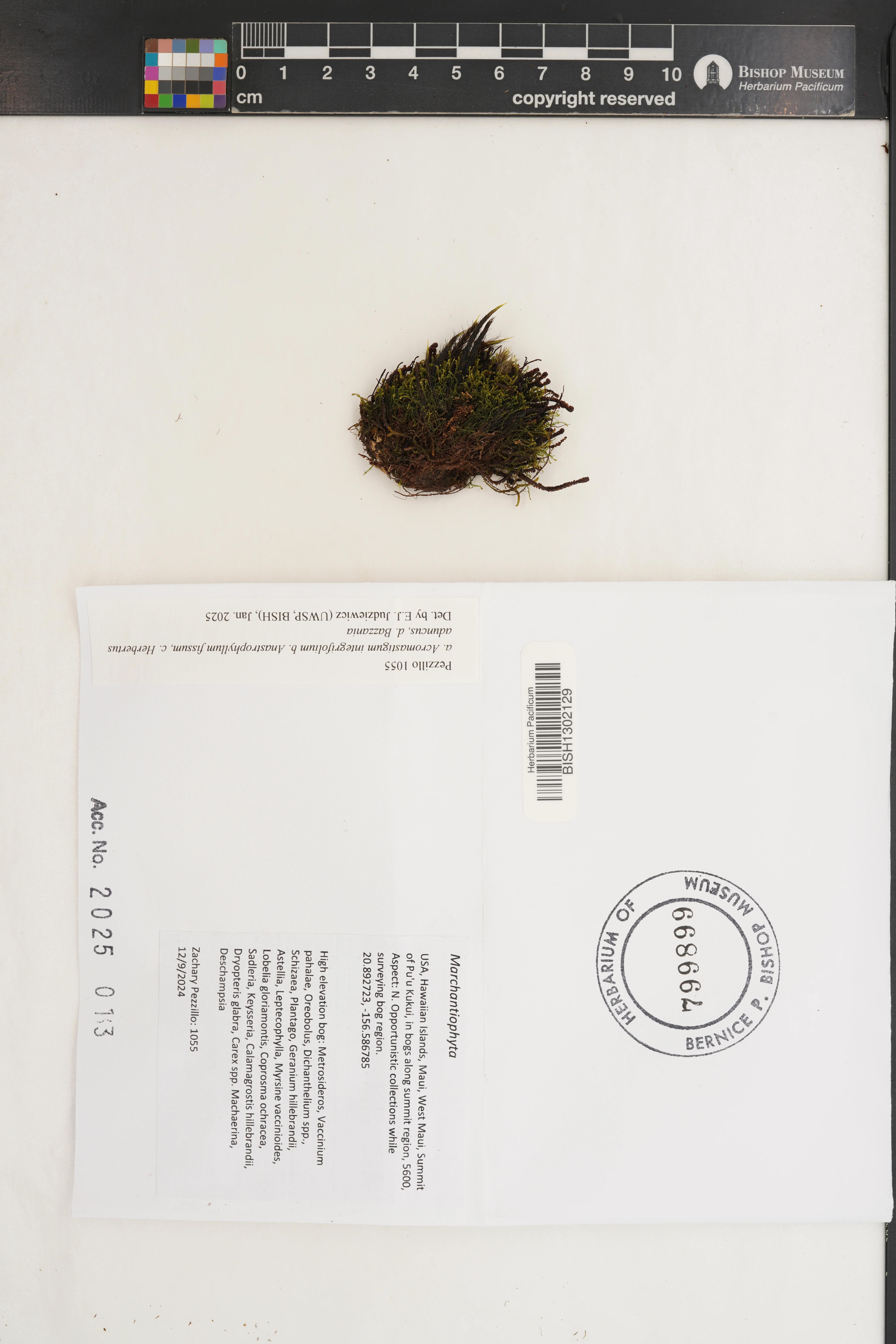 Kingdom: Viridiplantae Phylum: Marchantiophyta Class/Clade: Jungermanniopsida Order: Jungermanniales Family: Lepidoziaceae Genus: Acromastigum