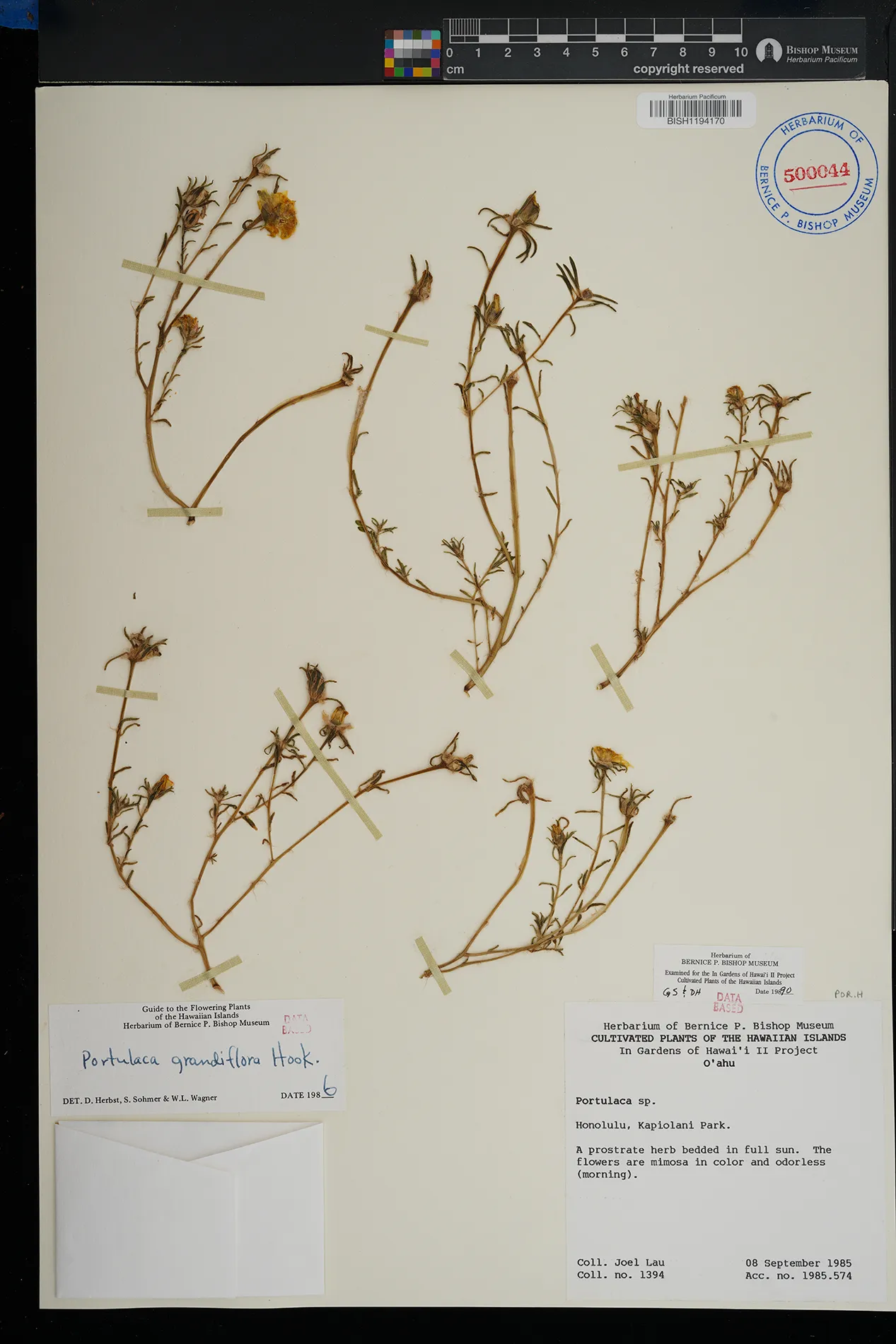 | 3 | Portulaca grandiflora | Hook. | kapiolani park | PRESERVED_SPECIMEN | lau, j. | collector number: 1394 | Oahu | BISH | 9/8/1985 | |