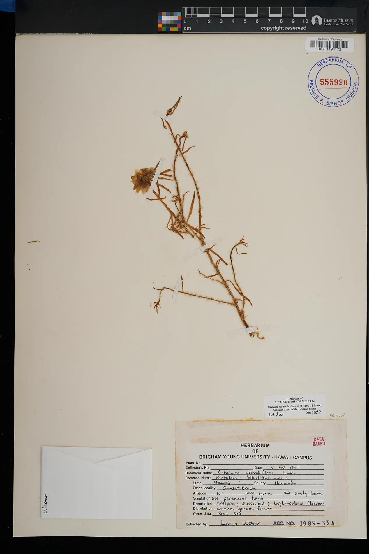 | 5 | Portulaca grandiflora | Hook. | sunset beach | Soil sandy loam | PRESERVED_SPECIMEN | weber, l. | collector number: 342 | Oahu | BISH | 2/11/1977 |