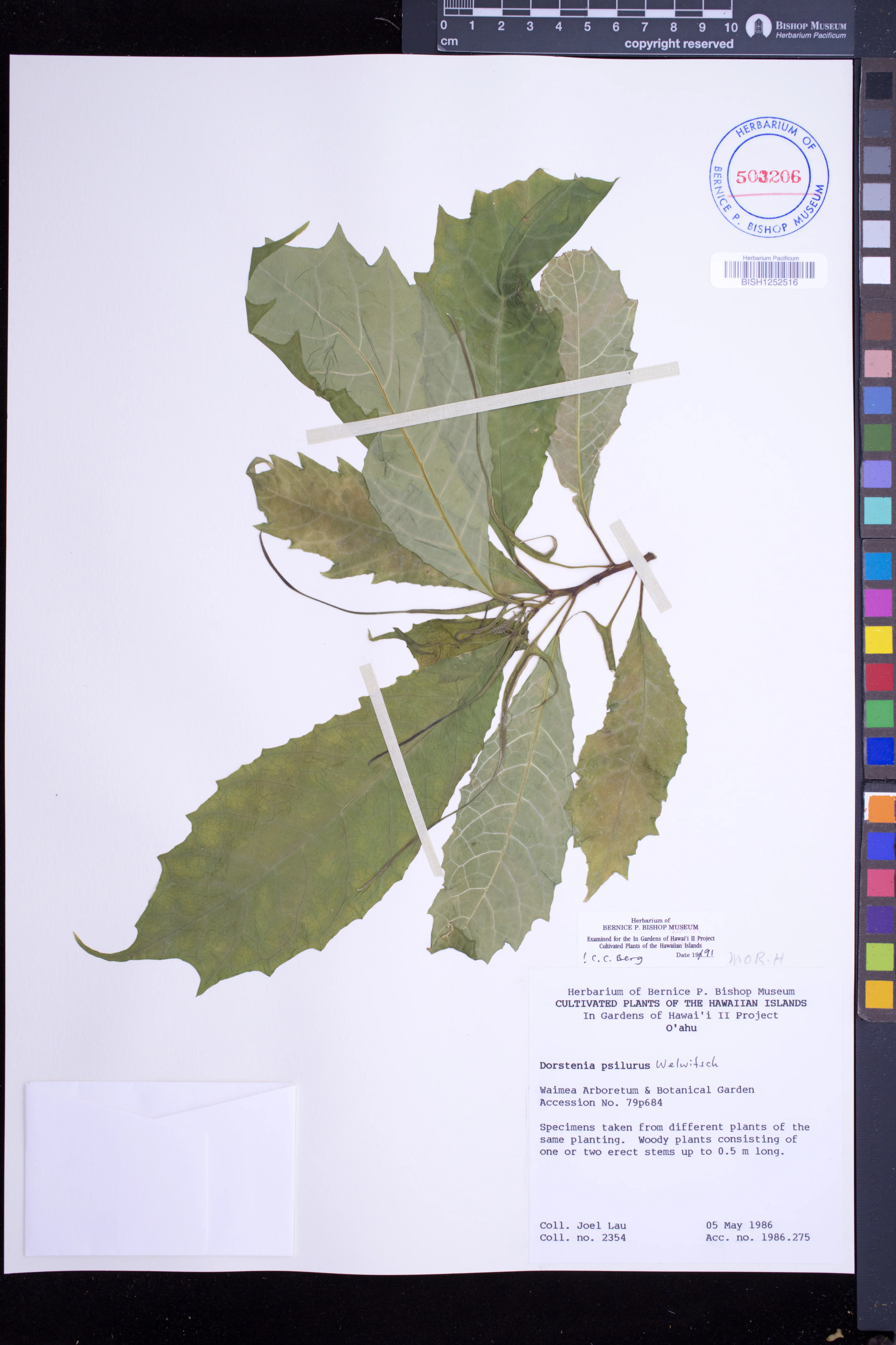 | 4 | Dorstenia psilurus | Welw. | waimea arboretum | PRESERVED_SPECIMEN | lau, j. | collector number: 2354 | Oahu | BISH | 5/5/1986 | |