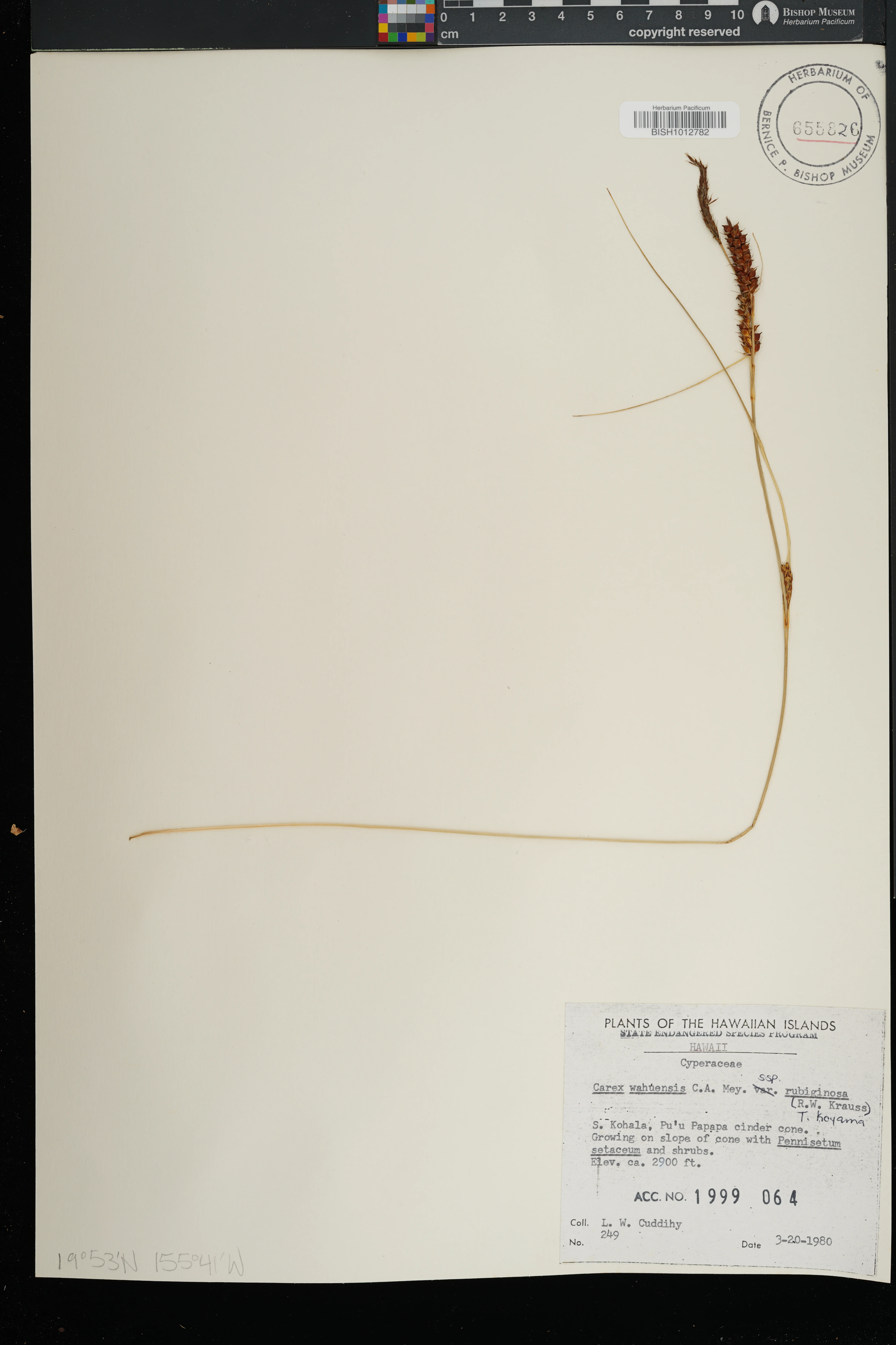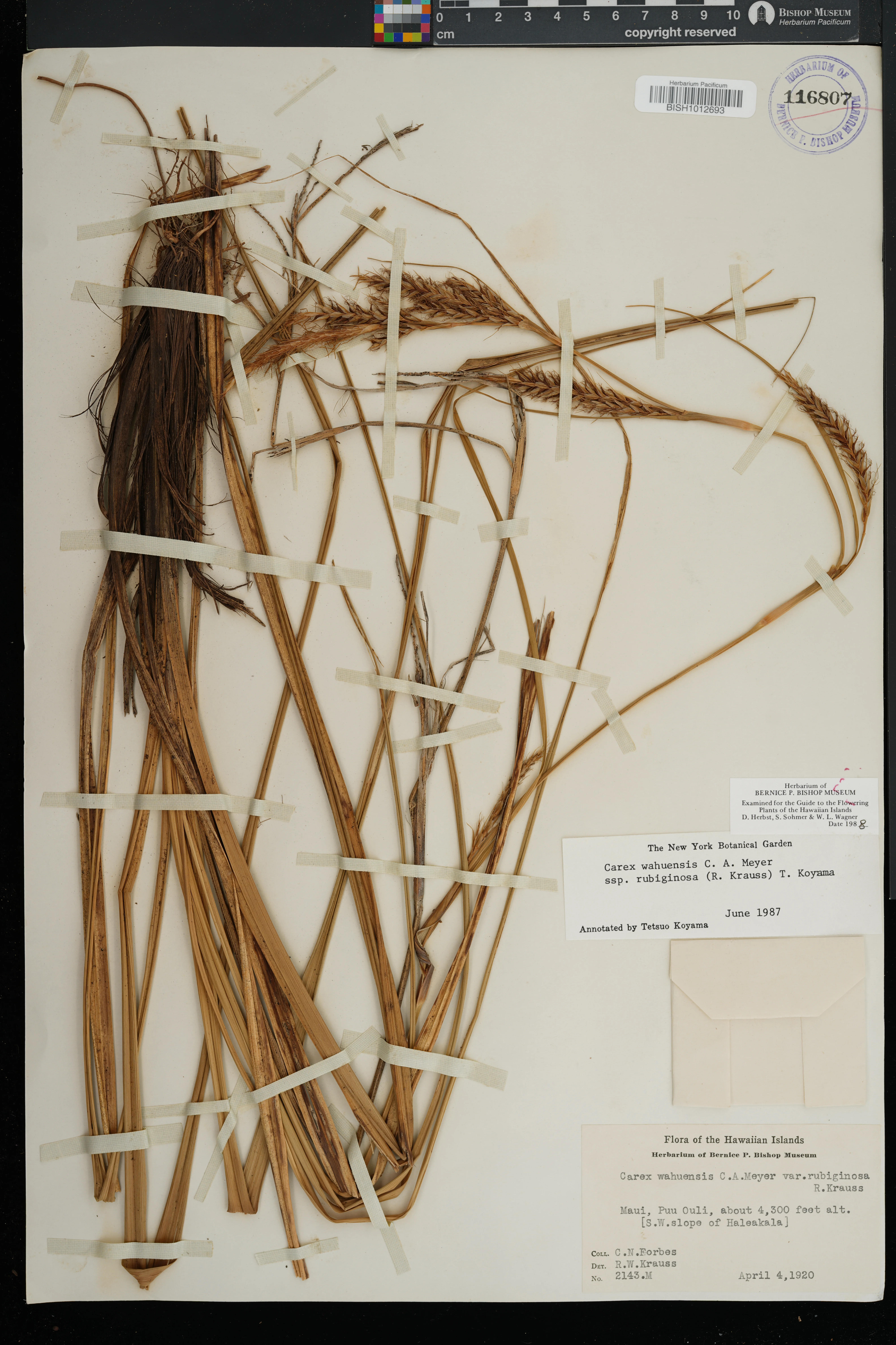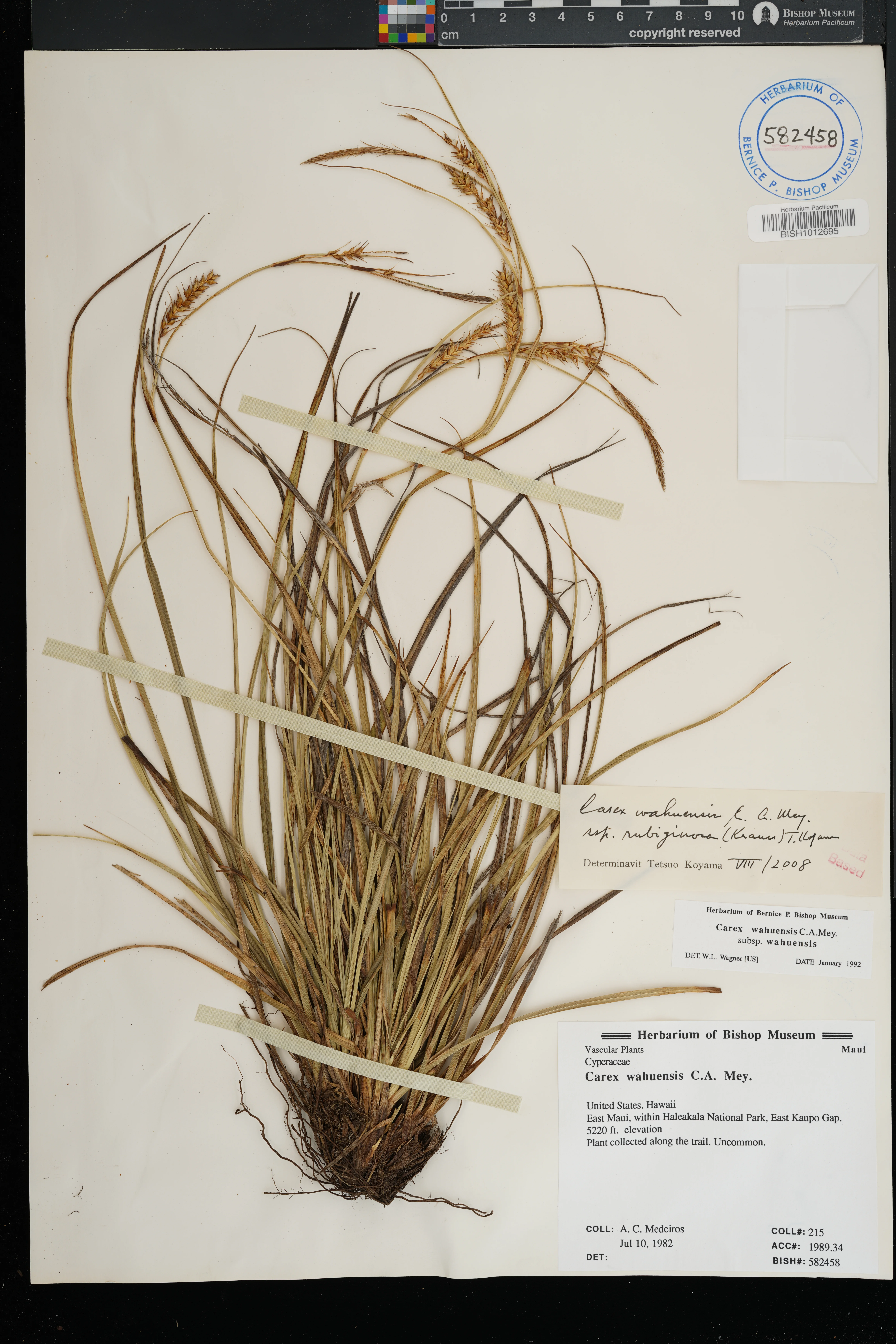 Flowers: Flowers in inflorescences (2–)4–9(–14)–nodose, with internodes 2–5 cm long, the spikes solitary at nodes, nodes occasionally with 2 spikes or with 3 secondary spikes, each spike pedunculate, cylindrical, 5–10 cm long, 5–15 mm wide, the terminal spike staminate, lateral ones androgynous or pistillate; bracts leaf-like, the lower 1–3 slightly longer than the inflorescence, long–sheathing at base; pistillate glumes brown, membranous, ovate, 2.5–5 mm long, margins hyaline, the midnerve prolonged into a scabrous awn 3–5 mm long; perigynium chartaceous to subcoriaceous, reddish brown to dark red at maturity, broadly obovoid, (3–)5–8 mm long, 2.5–4 mm wide, many–veined, obtusely trigonous in cross section, the apex contracted gradually or abruptly to the beak, the apical teeth sharp, 0.2–0.9 mm long, base obtuse. Flowers unisexual. Corolla (petals) absent. Ovary superior; style 1–2 mm long, the base continuous to the achene apex without any thickening; stigmas 3.