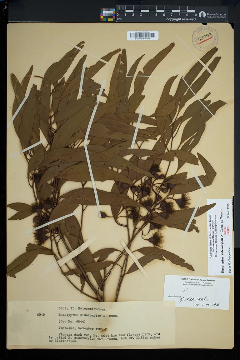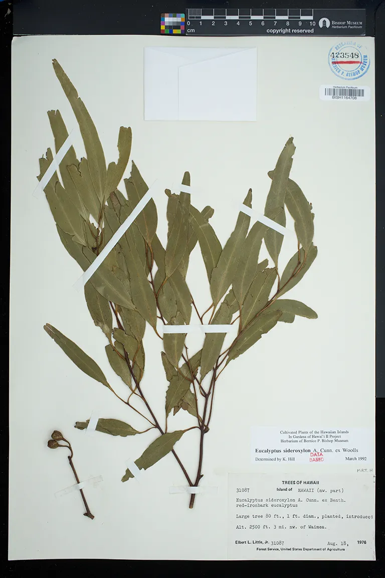 | 15 | Eucalyptus sideroxylon | A.Cunn. ex Woolls | kamuela | Planted. | PRESERVED_SPECIMEN | ewart iii, g.r. | collector number: 273 | Hawaii | BISH | 1/30/1932 |