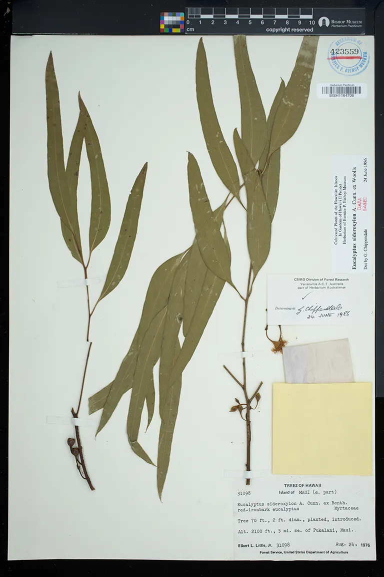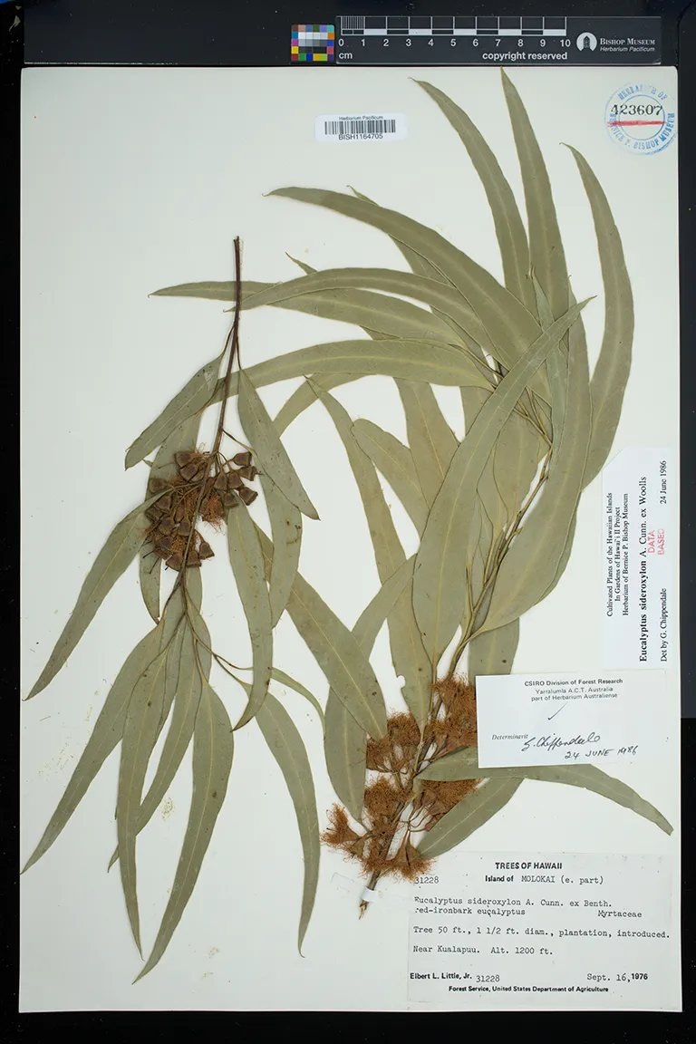 | 13 | Eucalyptus sideroxylon | A.Cunn. ex Woolls | 5 miles se of pukalani | Planted, introuduced. | PRESERVED_SPECIMEN | little jr., e.l. | collector number: 31098 | Maui | BISH | 8/24/1976 |