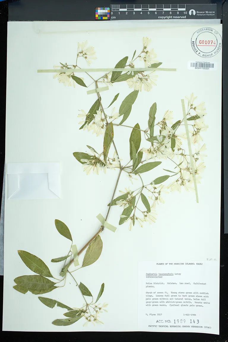 | 20 | Euphorbia leucocephala | Lotsy | koloa district: kalaheo. lae road | PRESERVED_SPECIMEN | flynn, t. | collector number: 3217 | Kauai | BISH | 12/1/1988 | |