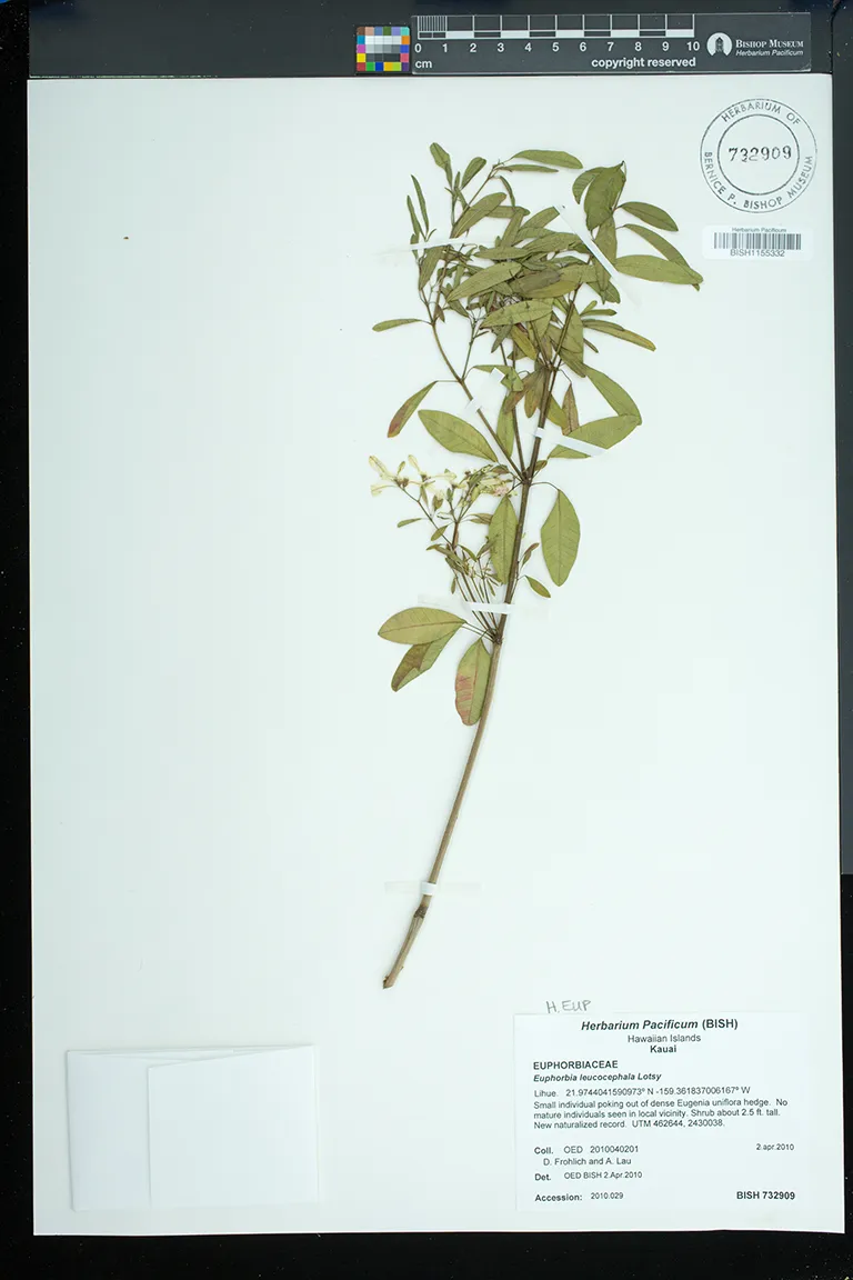 | 16 | Euphorbia leucocephala | Lotsy | Lihue | Small individual poking out of dense Eugenia uniflora hedge. No mature individuals seen in local vicinity. | PRESERVED_SPECIMEN | OED | 2010040201 | Kauai | BISH | 4/2/2010 |