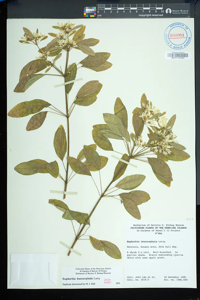 | 1 | Euphorbia leucocephala | Lotsy | honolulu, nuuanu area, 2616 pali hwy | In partial shade. | PRESERVED_SPECIMEN | lau, j. et al. | collector number: 1619.5 | Oahu | BISH | 11/16/1985 |
