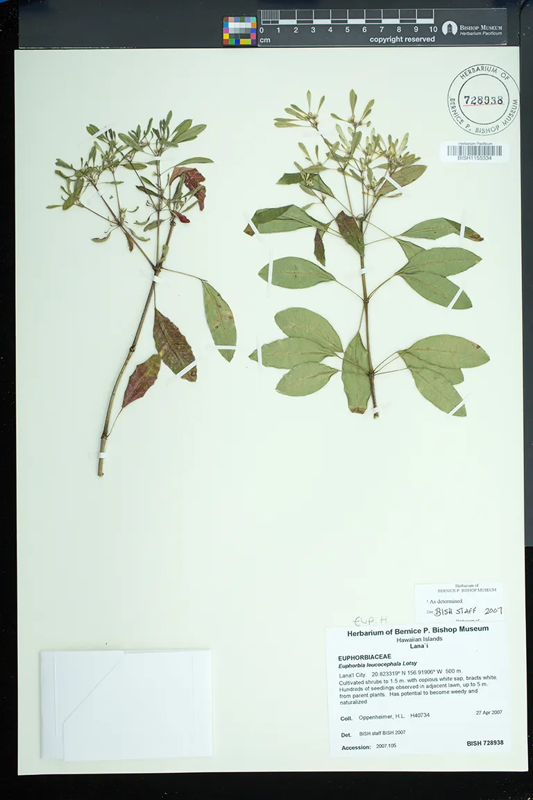 | 23 | Euphorbia leucocephala | Lotsy | Lana'I City | PRESERVED_SPECIMEN | Oppenheimer, H.L. | Collector Number: H40734 | Lanai | BISH | 4/27/2007 |