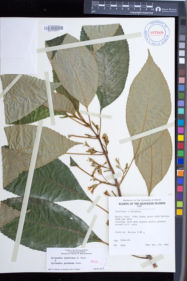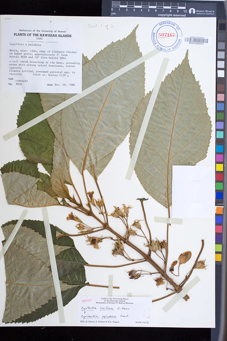 | 4 | Cyrtandra laxiflora × Cyrtandra paludosa | Heeia | kukui, Clidemia | Preserved_Specimen | tall shrub, branching at base, ascending stems with strong apical dominence, leaves opposite | Takeuchi, W.N. | 3048 | Oahu | BISH | 1986-11-29 |