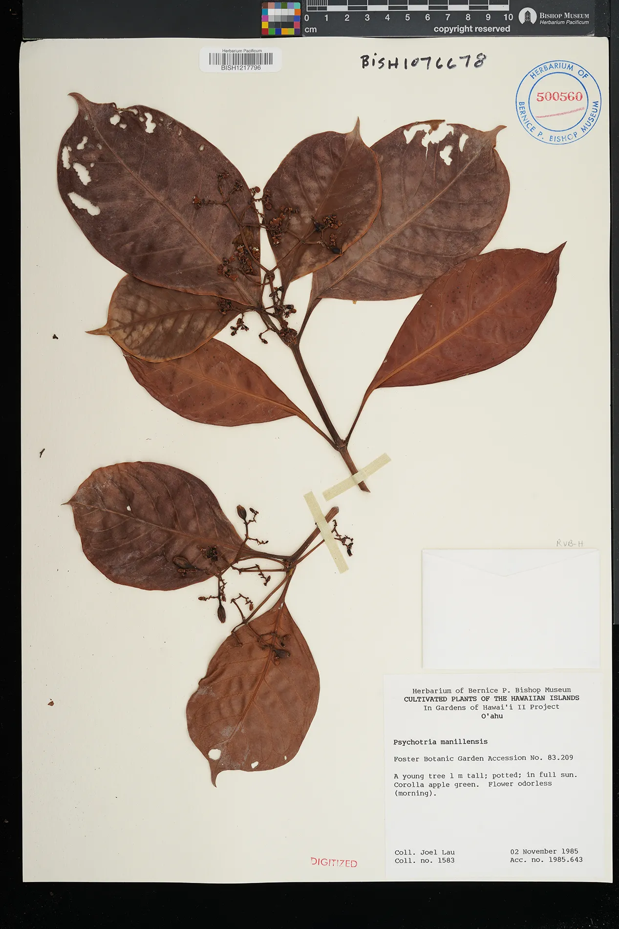 | 7 | Psychotria manillensis | Bartl. ex DC. | foster botanic garden | Potted, in full sun. | PRESERVED_SPECIMEN | lau, j. | collector number: 1583 | Oahu | BISH | 11/2/1985 |