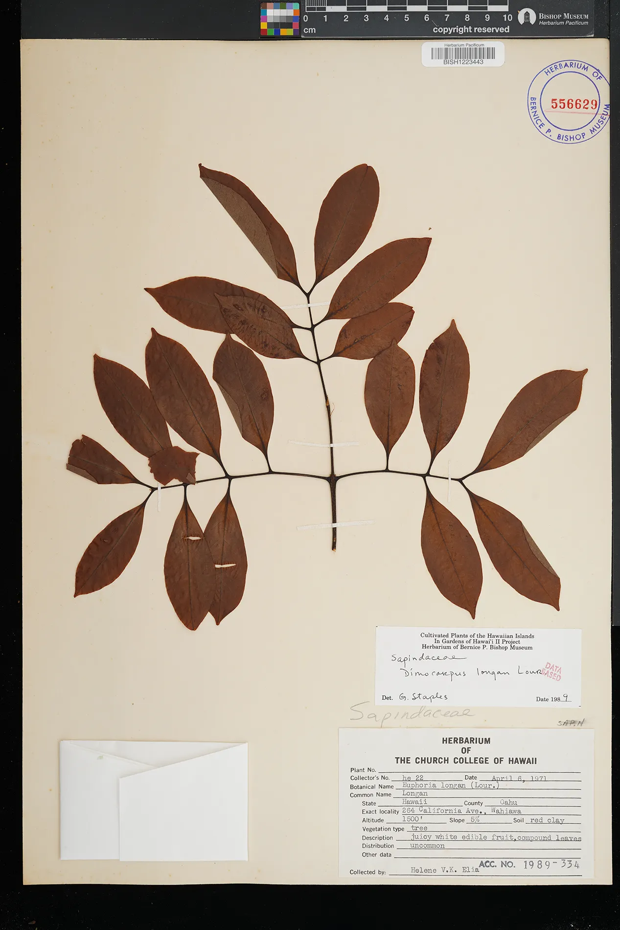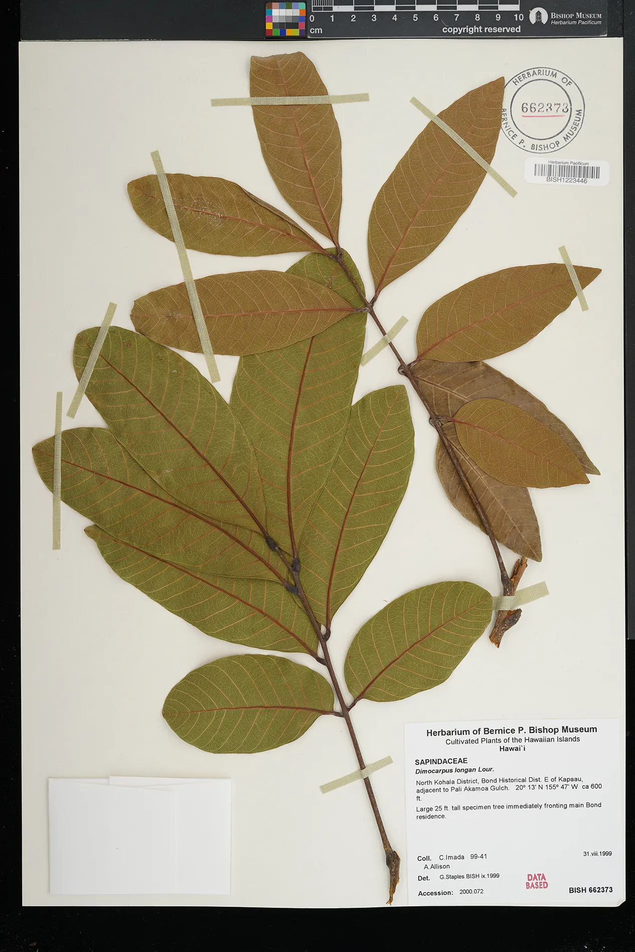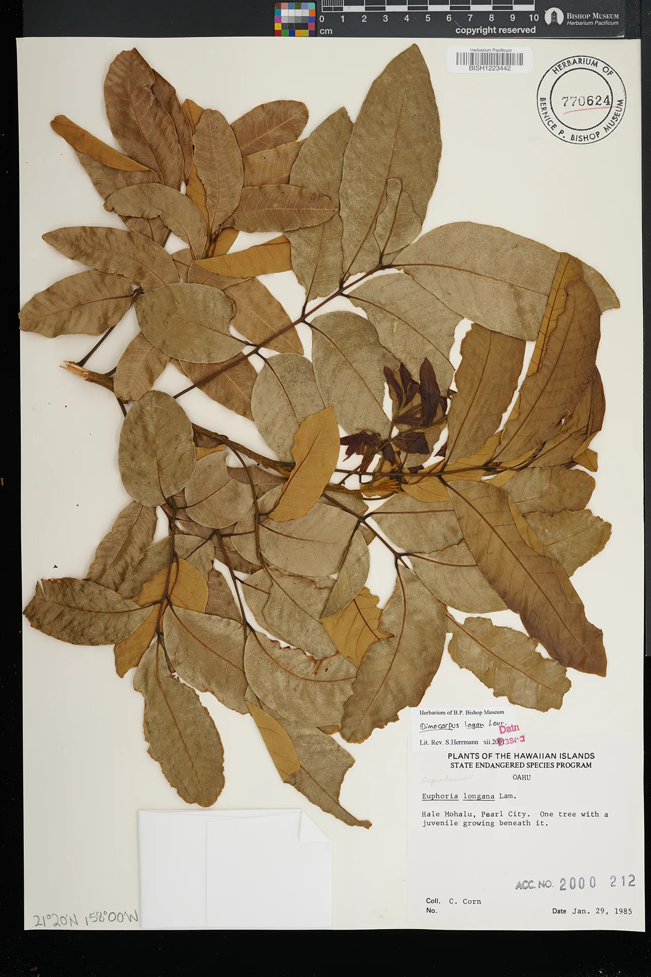 | 1 | Dimocarpus longan | Lour. | Hale Mohalu, Pearl City | PRESERVED_SPECIMEN | Corn, C. | Collector Number: s.n. | Oahu | BISH | 1/29/1985 | |