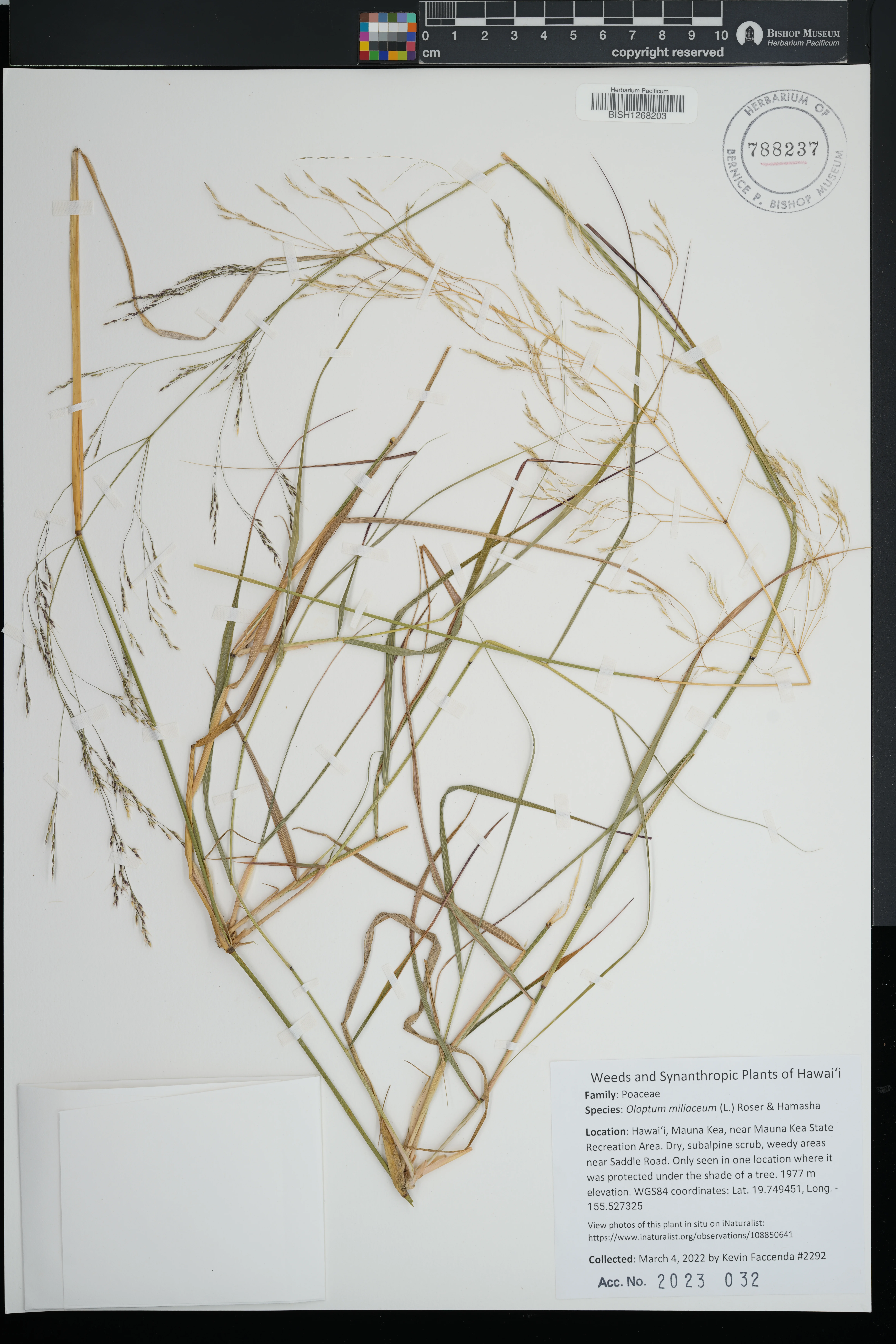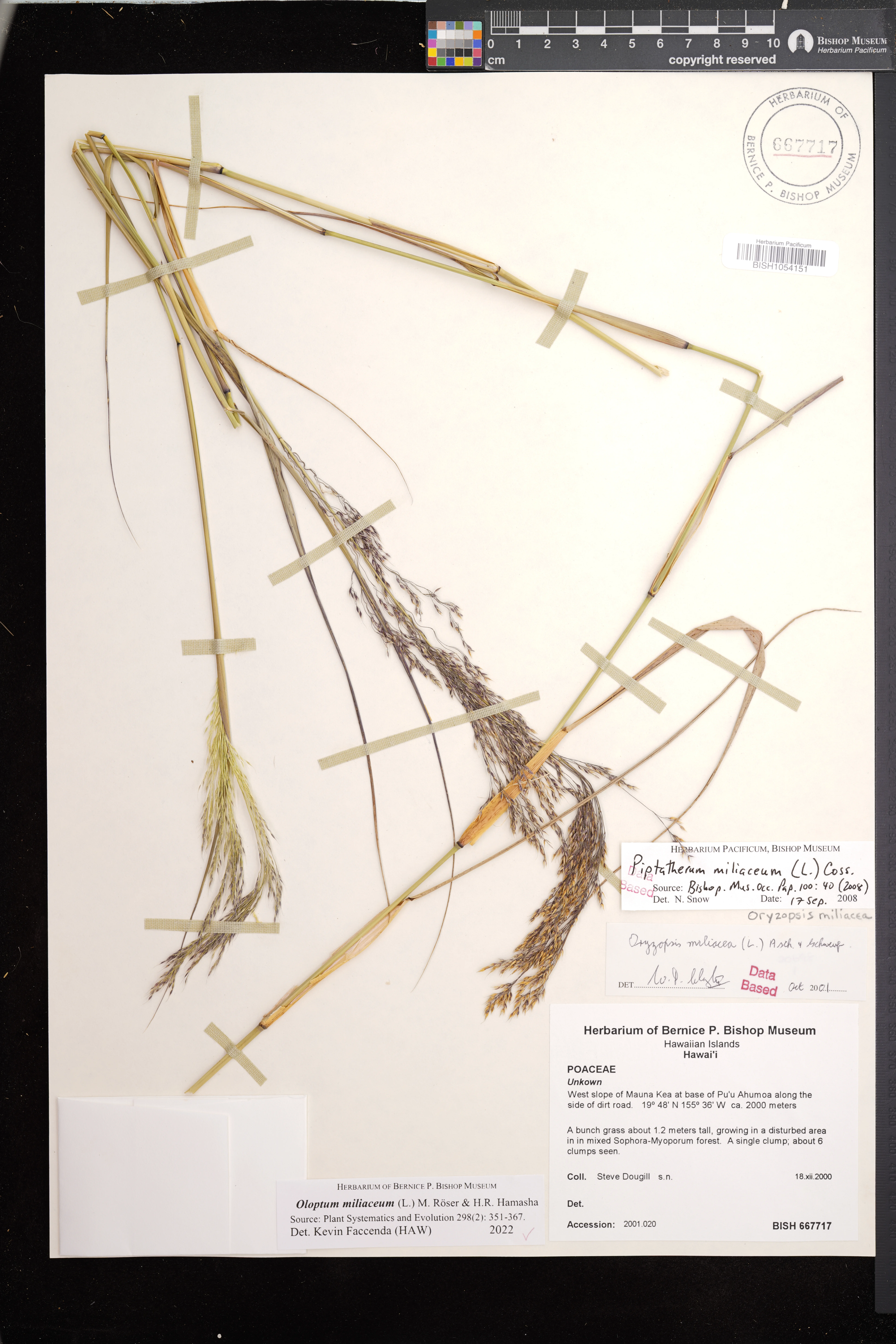 | 7 | Oloptum miliaceum | (L.) Röser & Hamasha | West slope of Mauna Kea at base of Puu Ahumoa along the side of dirt road | PRESERVED_SPECIMEN | Dougill, S. | Collector Number: s.n. | Hawaii | BISH | 12/18/2000 |