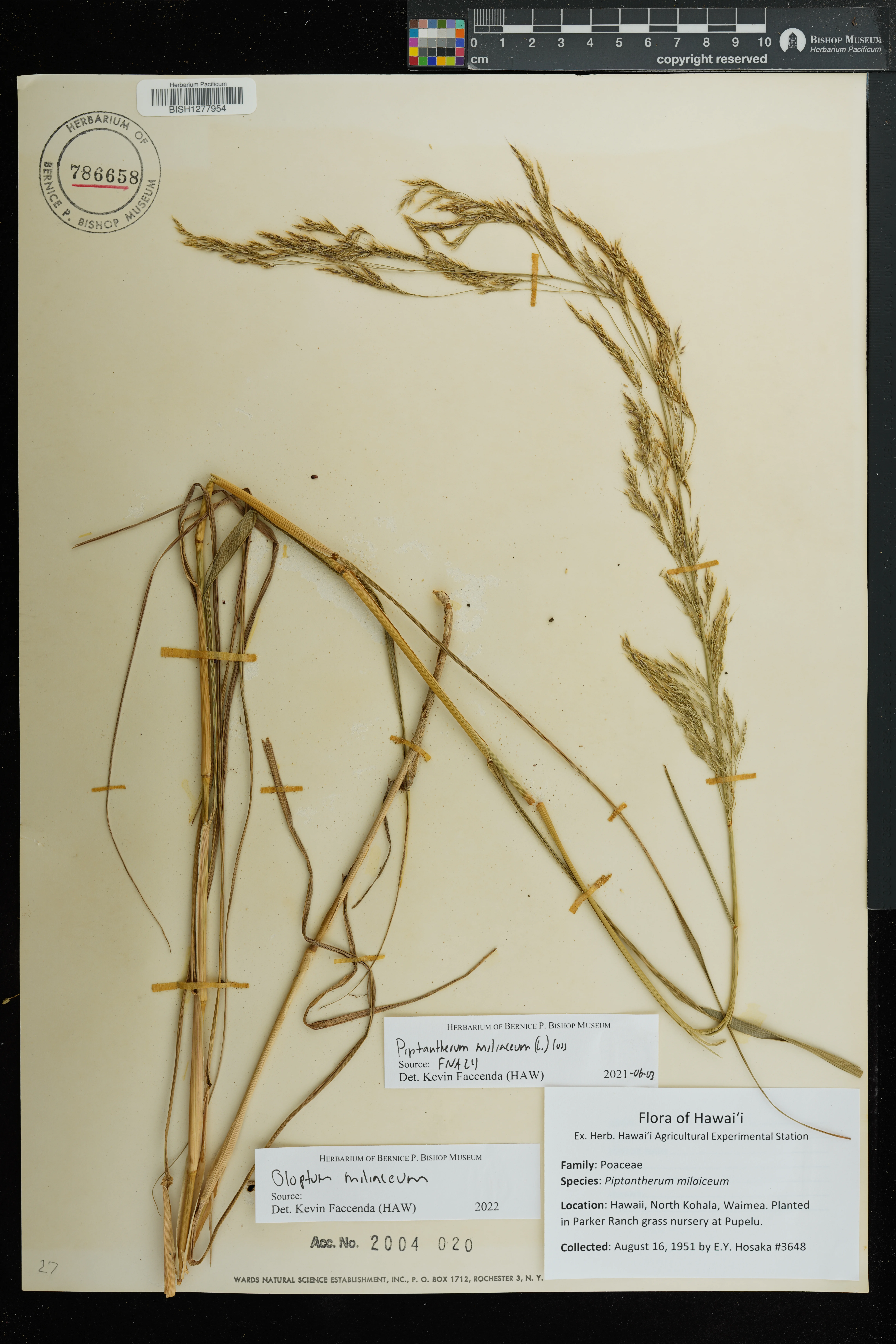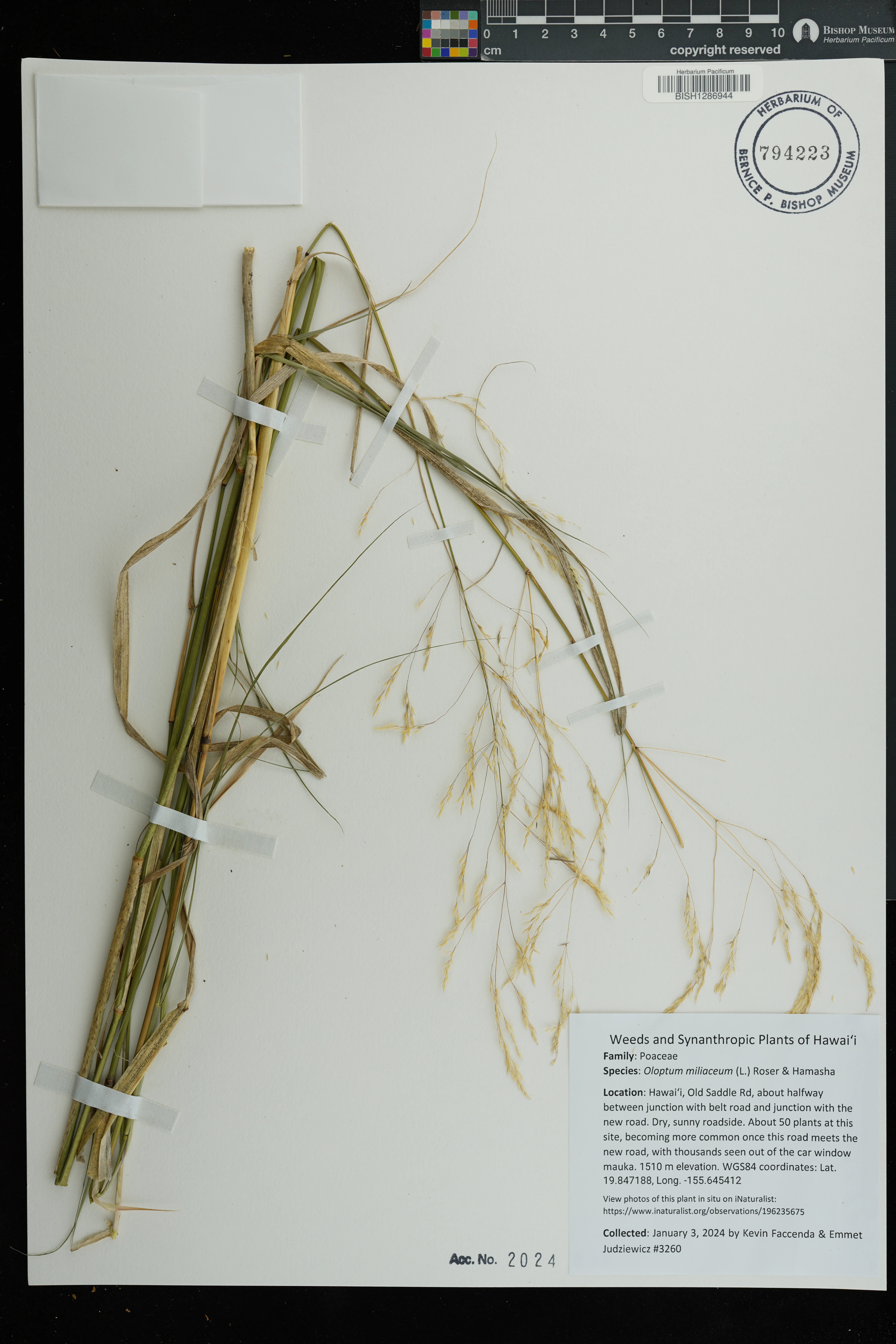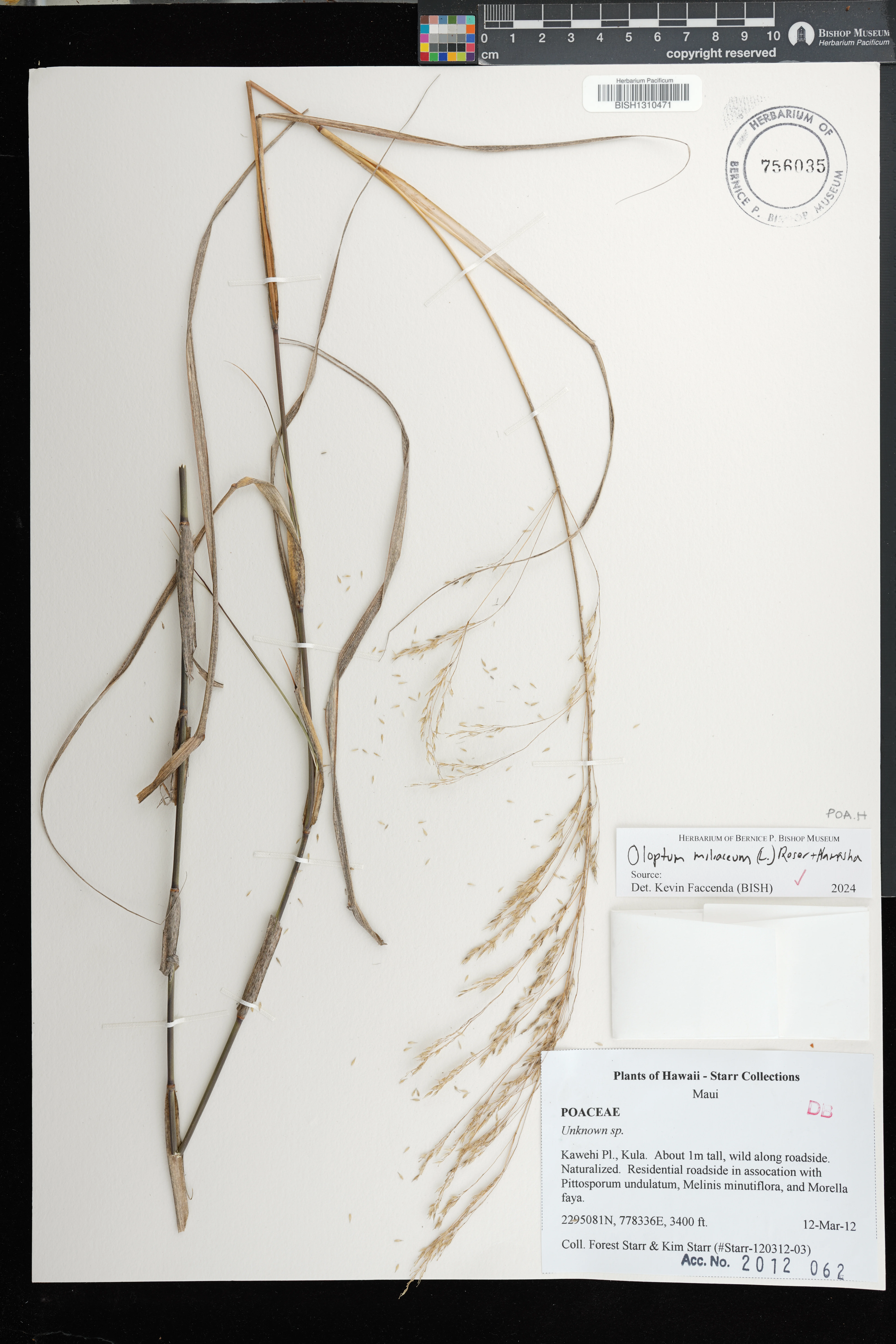 | 6 | Oloptum miliaceum | (L.) Röser & Hamasha | West slope of Mauna Kea at base of Puu Ahumoa along the side of dirt road | PRESERVED_SPECIMEN | Dougill, S. | s.n. | Hawaii | BISH | 12/18/2000 | |