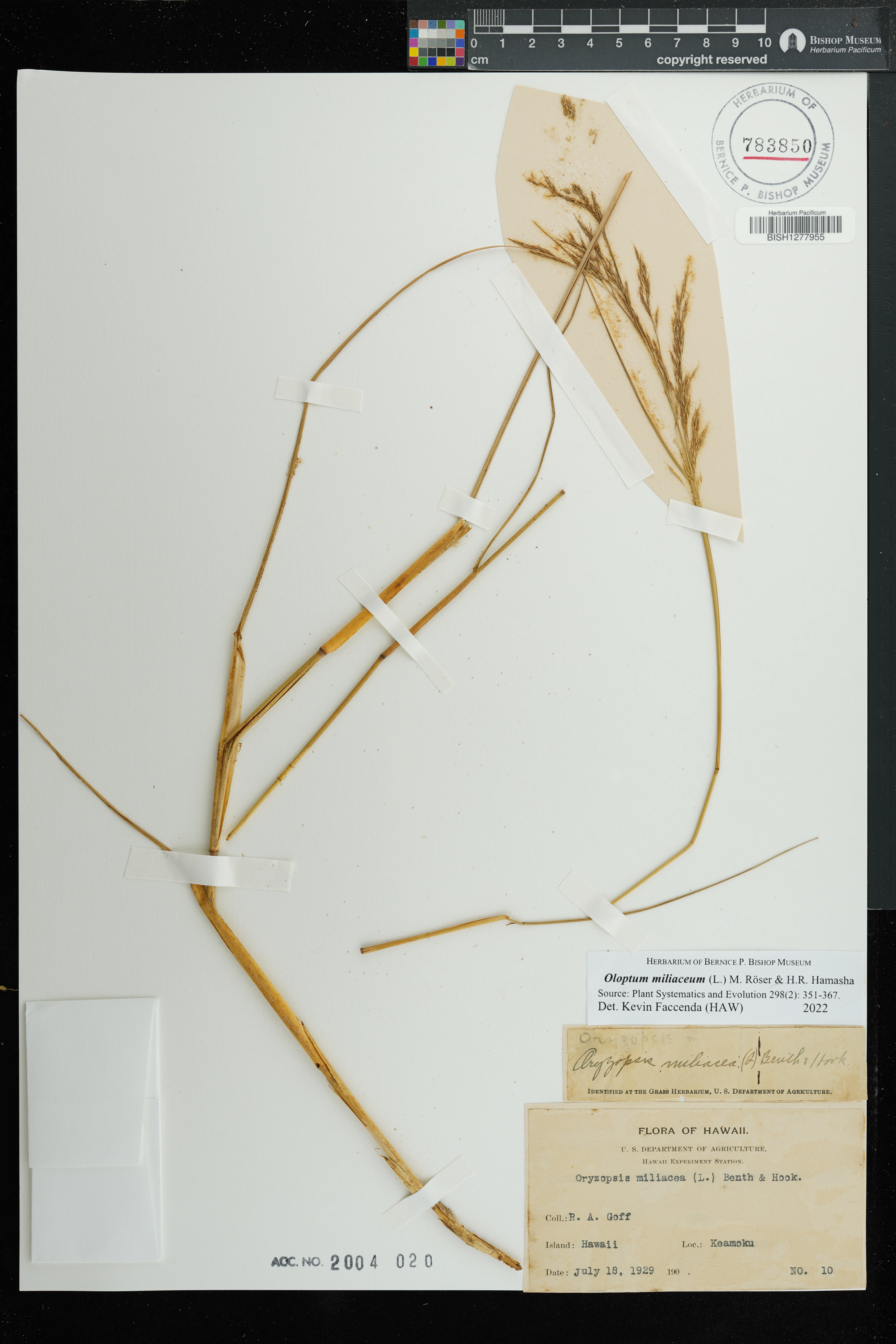 | 1 | Oloptum miliaceum | (L.) Röser & Hamasha | keamoku | PRESERVED_SPECIMEN | r. goff | 10 | Hawaii | US | 7/18/1928 | |