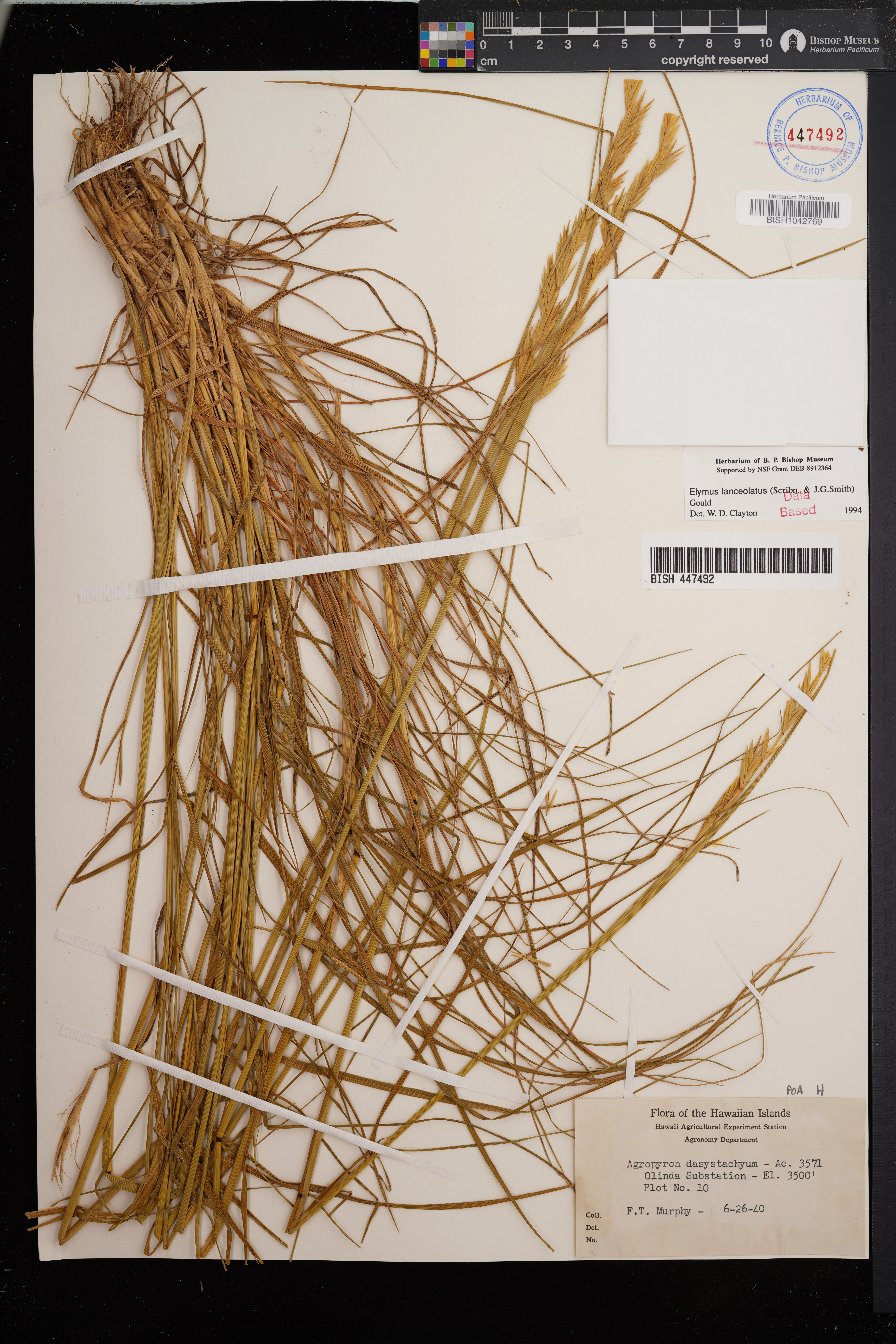 | 2 | Elymus lanceolatus | (Scribn. & J.G.Sm.) Gould | Olinda, Hi Agr Ex. Sta., substation | Plot no. 10. | PRESERVED_SPECIMEN | Murphy, F.T. | s.n. | Maui | BISH | 6/26/1940 |