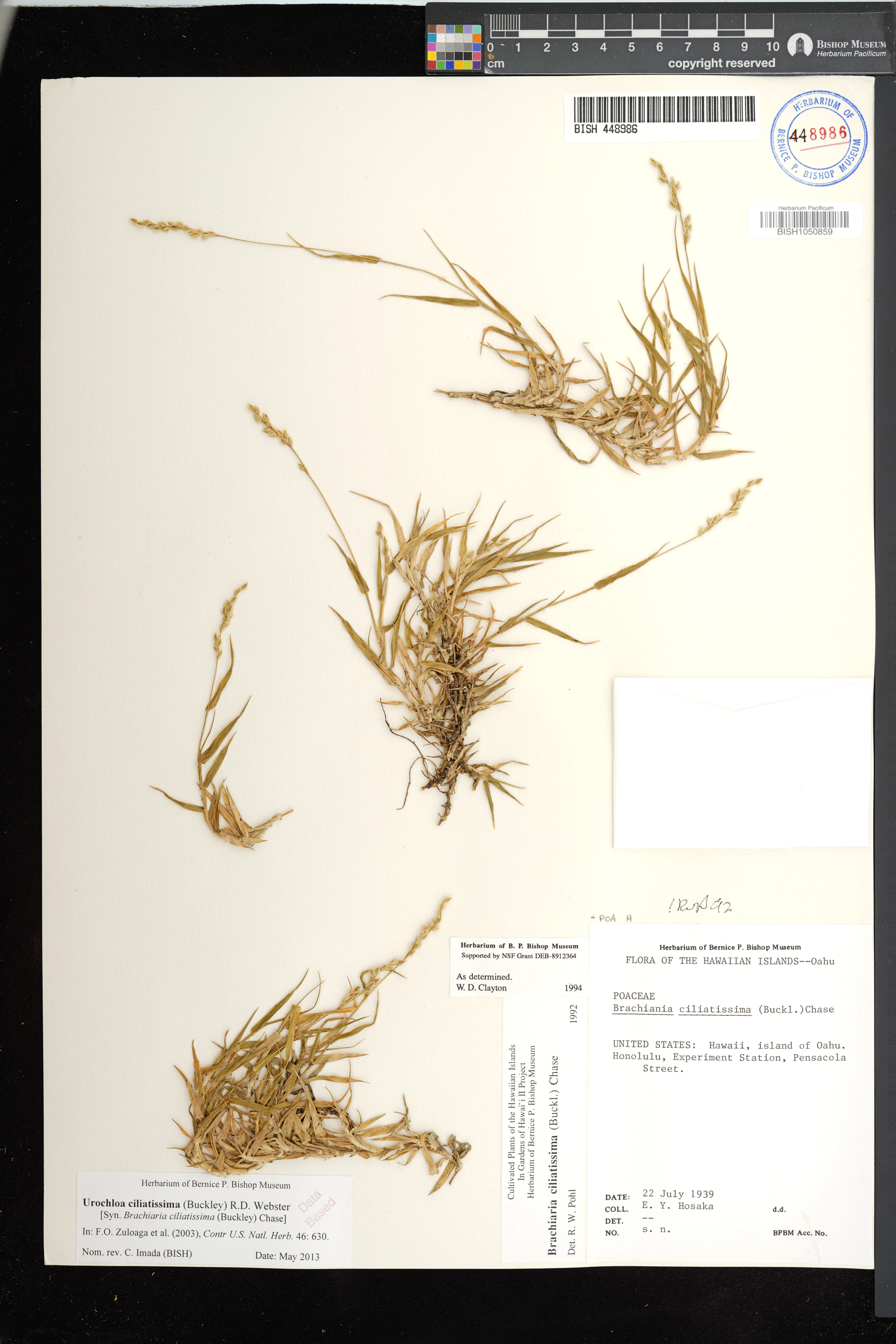 | 2 | Urochloa ciliatissima | (Buckley) R.D.Webster | honolulu; experiment station, pensacola street | PRESERVED_SPECIMEN | hosaka, e.y. | collector number: s.n. | Oahu | BISH | 7/22/1939 |