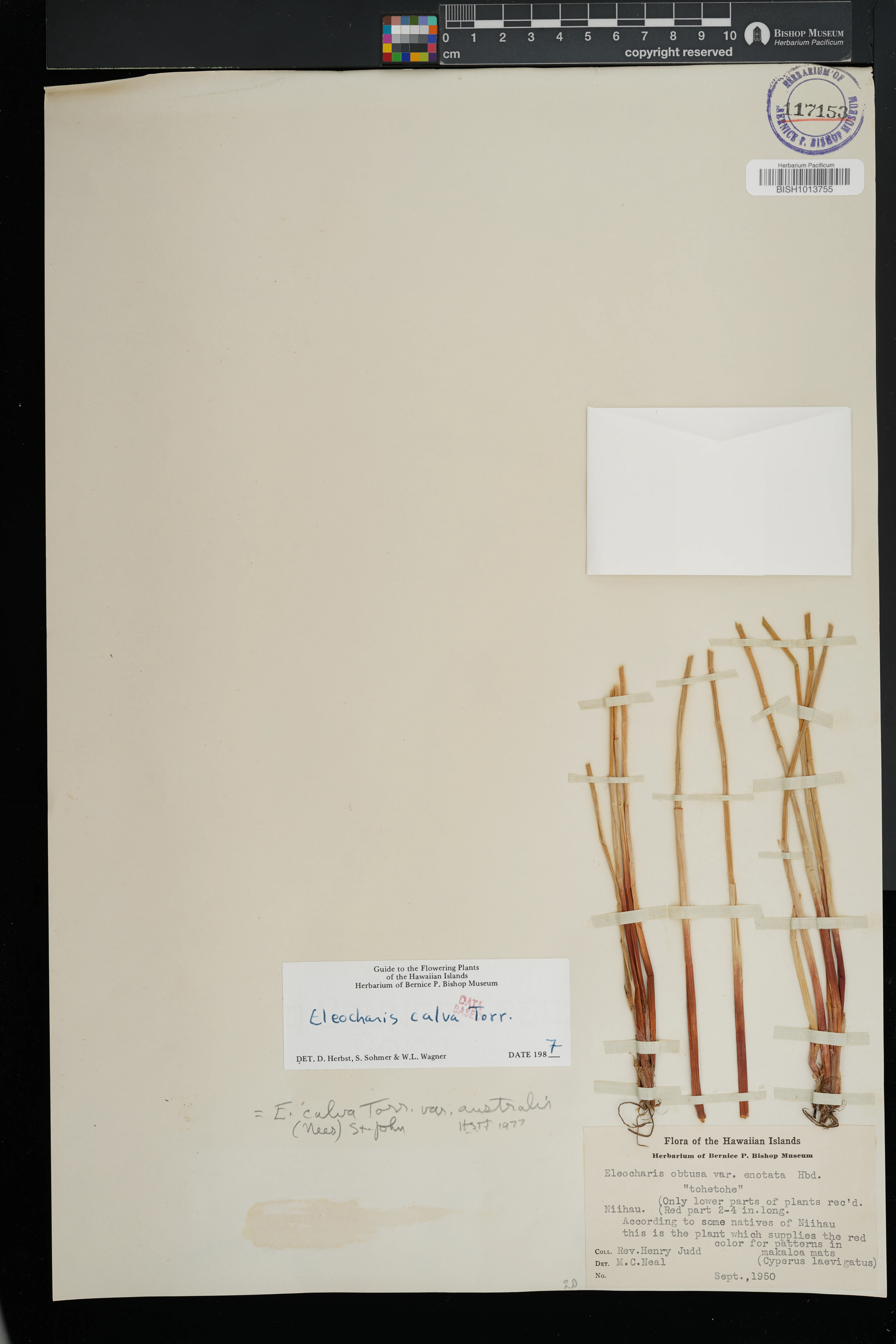| 8 | Eleocharis erythropoda | Steud. | Niihau | PRESERVED_SPECIMEN | Judd, Rev. H. | s.n. | Niihau | BISH | 9/1/1950 | |
