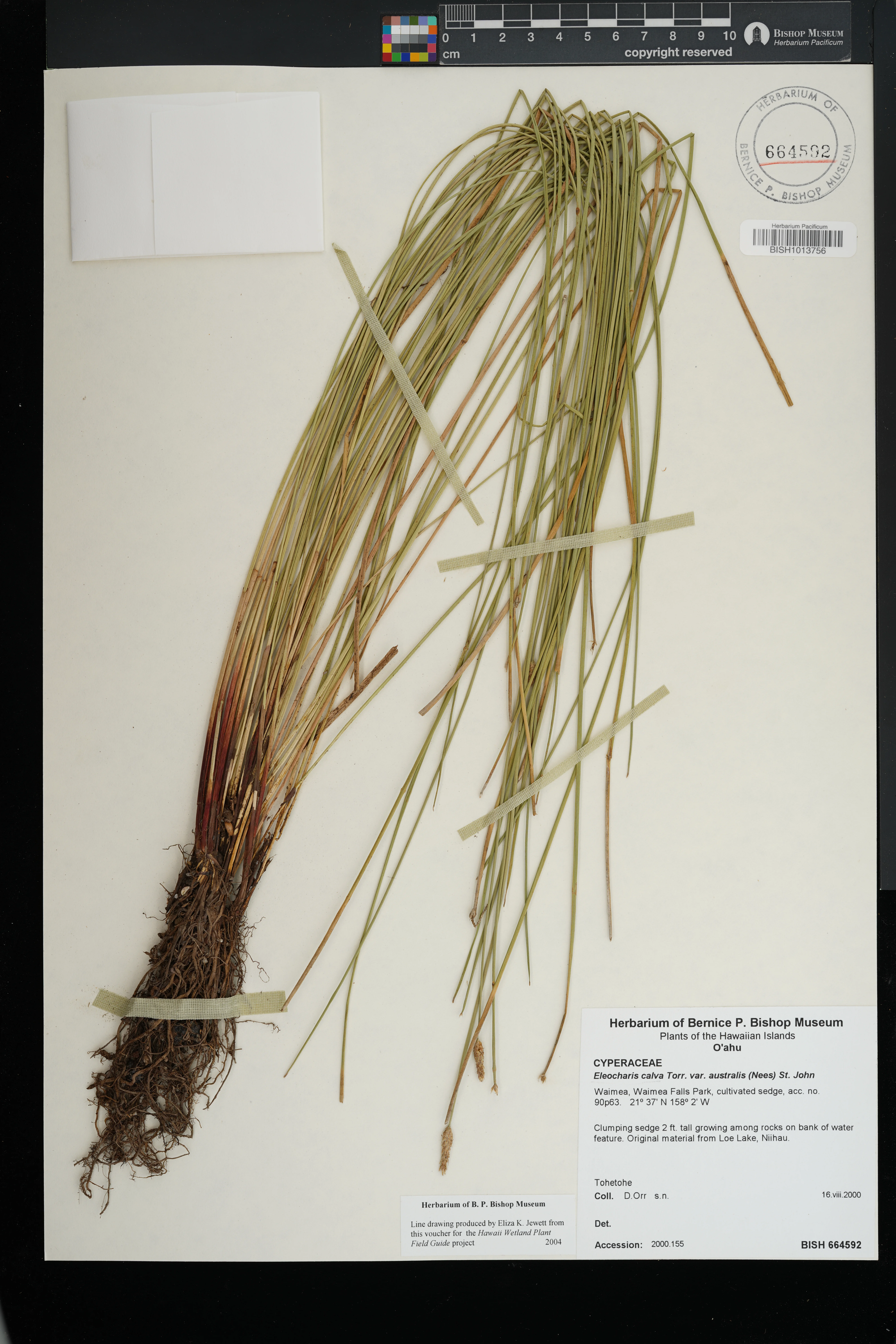 | 17 | Eleocharis erythropoda | Steud. | Waimea, Waimea Falls Park, cultivated sedge, acc. no. 90p63 | Clumping sedge 2 ft. tall growing among rocks on bank of water feature. Original material from Loe Lake, Niihau. | PRESERVED_SPECIMEN | Orr, D. | s.n. | Oahu | BISH | 8/16/2000 |