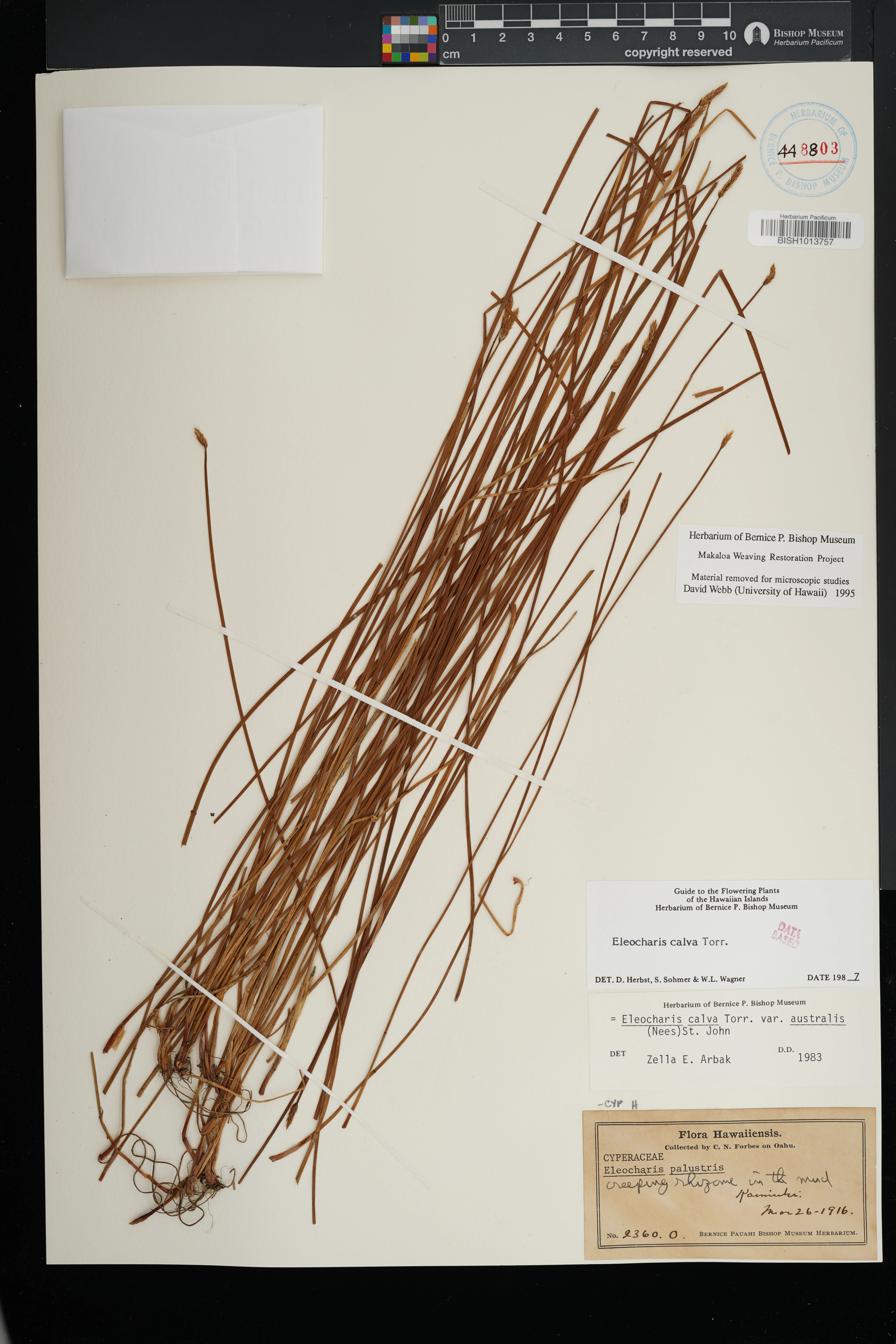 | 12 | Eleocharis erythropoda | Steud. | Kaimuki | PRESERVED_SPECIMEN | Forbes, C.N. | 2360.O | Oahu | BISH | 3/26/1916 | |