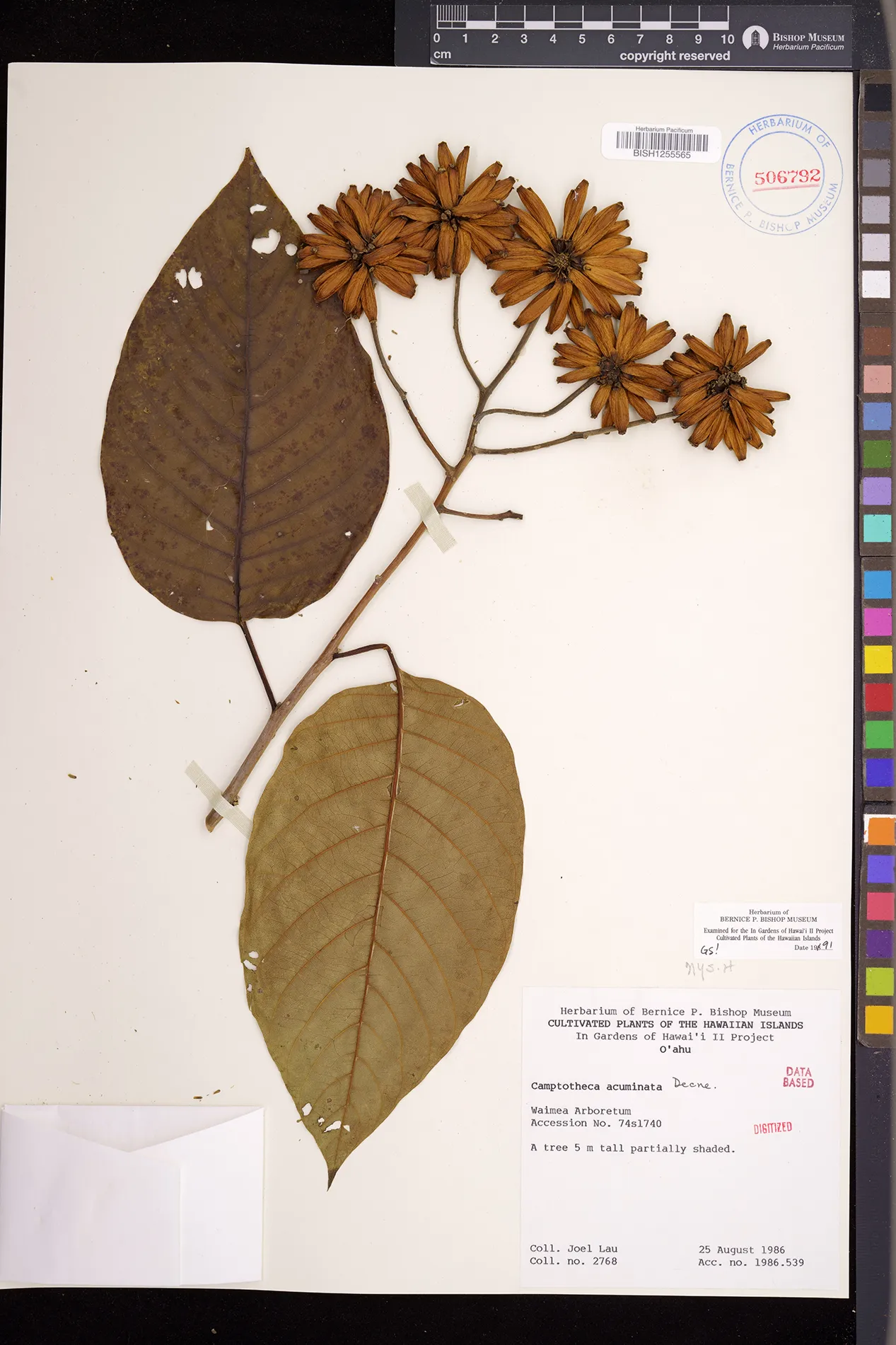 | 2 | Camptotheca acuminata | Waimea Arboretum. Accession # 74s1740 | Preserved_Specimen | Lau, J. | 2768 | Oahu | BISH | 1986-08-25 | |