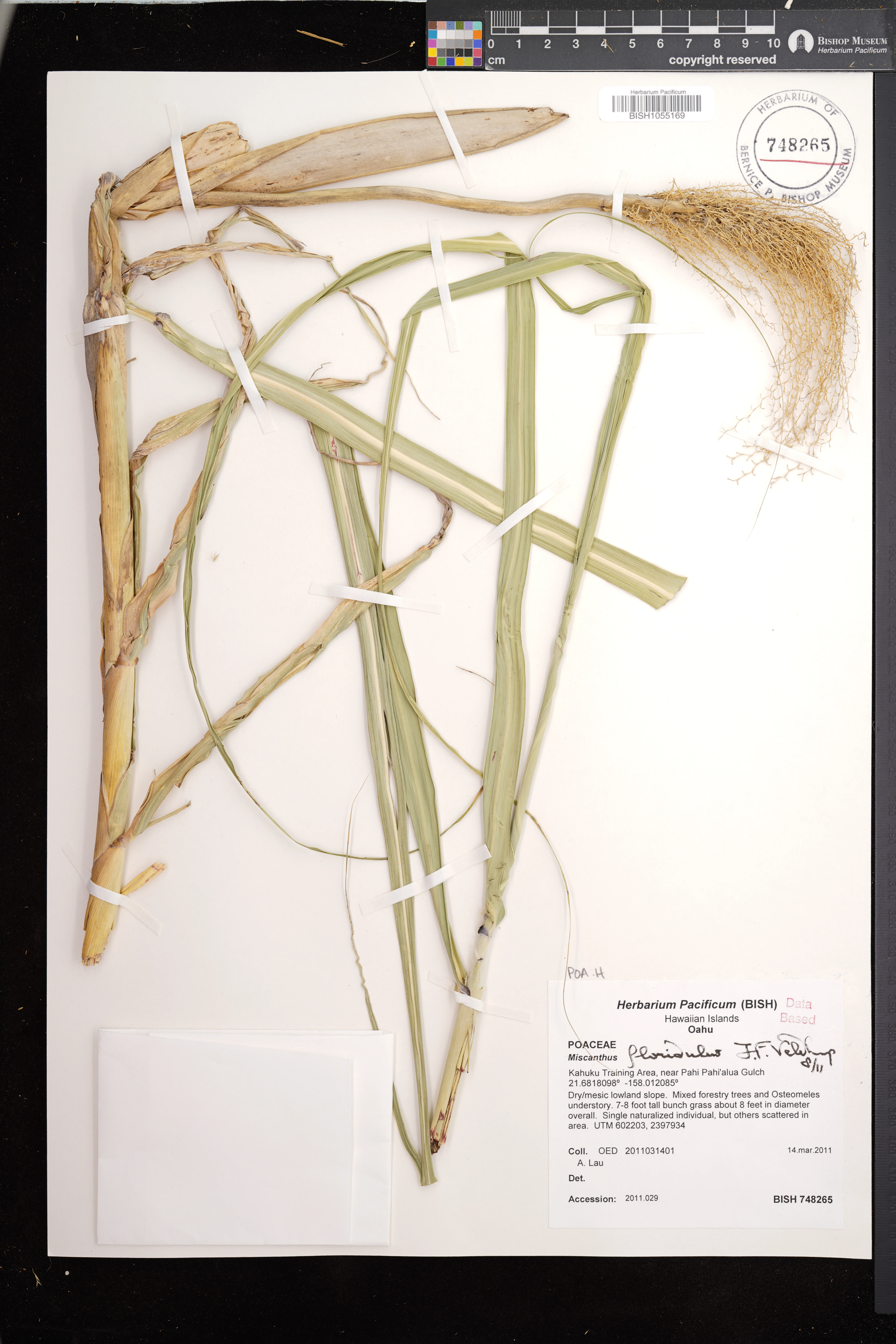 | 4 | Miscanthus floridulus | (Labill.) Warb. ex K.Schum. & Lauterb. | Kahuku Training Area, near Pahipahialua Gulch | Dry/mesic lowland slope. Mixed forestry trees and Osteomeles understory. | PRESERVED_SPECIMEN | OED | 2011031401 | Oahu | BISH | 3/14/2011 |