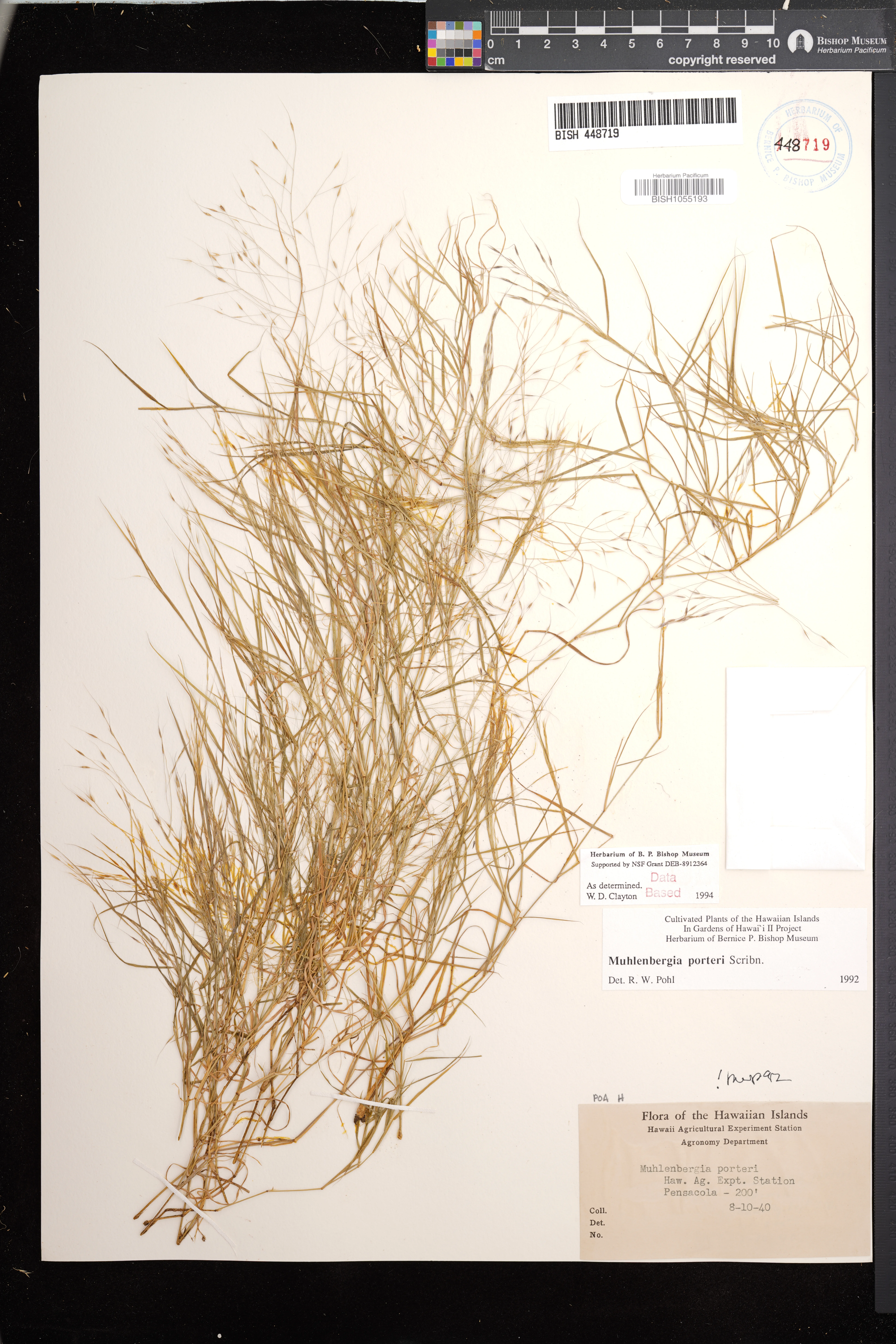 | 1 | Muhlenbergia porteri | Scribn. | Haw. Ag. Expt. Station, Pensacola | PRESERVED_SPECIMEN | s.n. | Oahu | BISH | 8/10/1940 | ||
