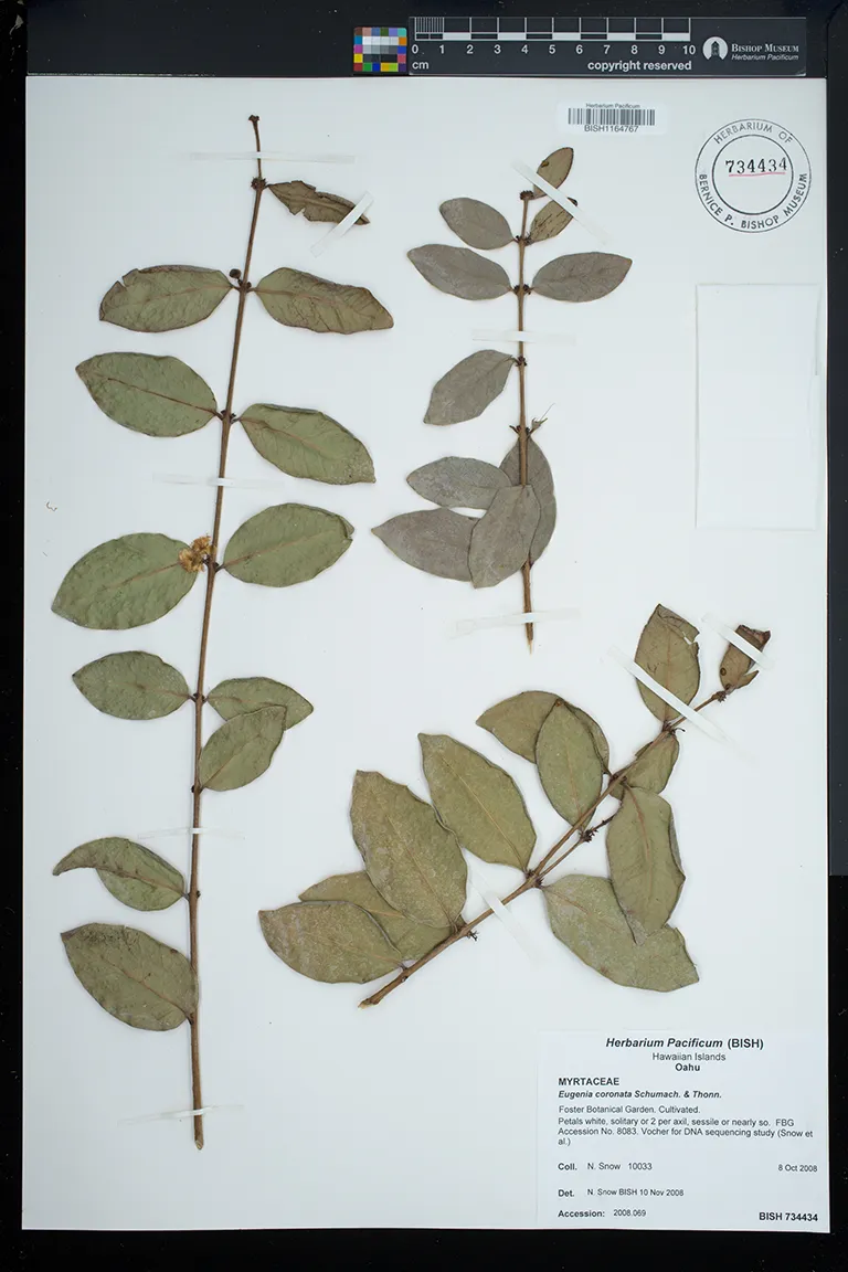 | 3 | Eugenia coronata | Foster Botanical Garden. Cultivated | Preserved_Specimen | Petals white, solitary or 2 per axil, sessile or nearly so. | Snow, N. | 10033 | Oahu | BISH | 2008-10-08 |